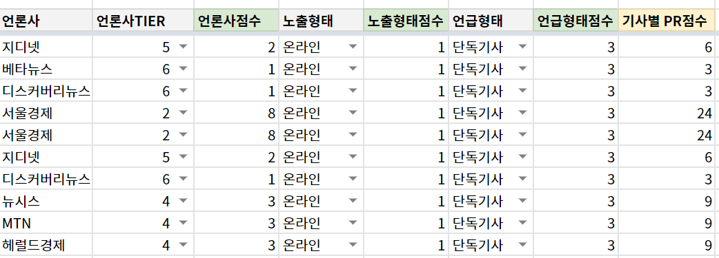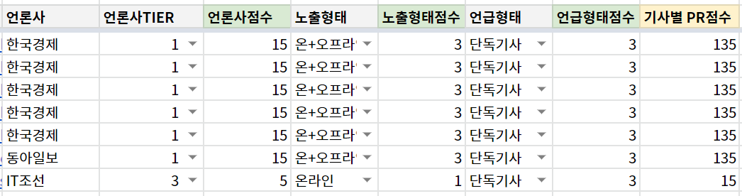 저도 배포 기사 현황 체크를 해보니, 그동안 티어가 낮은 언론사에 배포한 단건 기사가 많아 좋은 점수를 받기가 어려웠습니다. 언론사의 티어 기준은 인터넷상에서 공개되어 있는 언론사별 발행부수를 바탕으로 하는데요. 사실 해당 기준으로 하면 모두 1점짜리 언론사에 배포했다고 봐야 하여(!), 당시 회사의 PR 상황을 기준으로 나름대로 티어를 조금씩 조정했습니다. 그래도 5-6 티어 언론사 배포가 매우 많아서 곱셈을 해도 점수가 1 자릿수였네요. 어쨌든 결론은 명확했습니다. '티어가 높은 언론사에서 우리를 기사로 다뤄야 하는구나.'