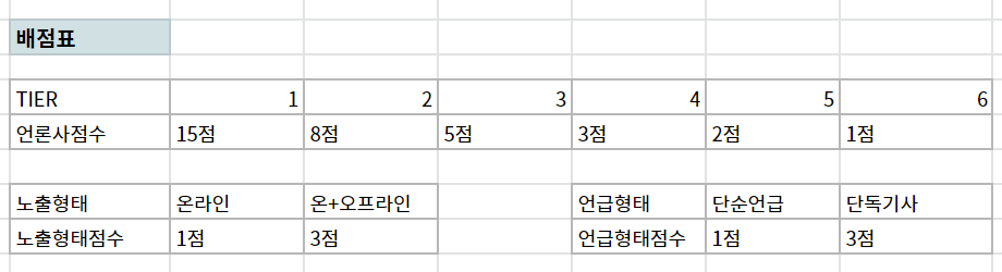 PR의 배점 방식은 B2B 마케팅-세일즈에서 리드 스코어링(Lead Scoring) 하는 방법과 닮아 있습니다. 포인트는 (1) 언론사 티어(tier), (2) 기사 노출 방식(온/오프라인), (3) 언급 방식(직접/간접)의 순서로 배포된 기사의 가치를 점수화하는 겁니다. 가장 중요한 건 역시나 언론사가 얼마나 주류에 속하느냐인데요.