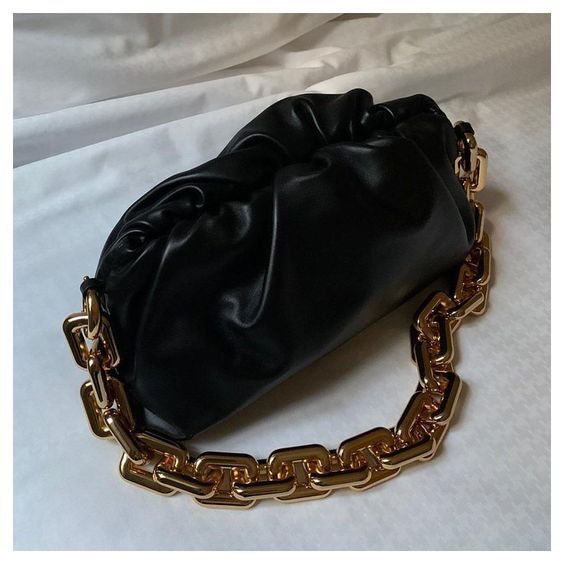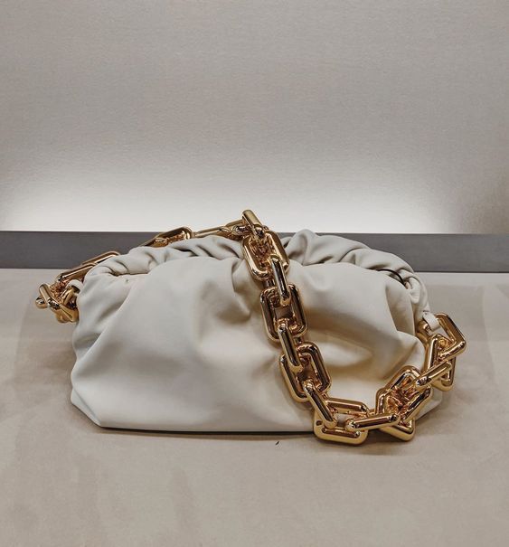 이건 기존의 파우치에 체인을 단 체인파우치다. 보테가베네타에서 체인 목걸이 팔찌 등의 악세사리가 많이 나오면서 체인 악세사리가 작년에 유행했었는데 이번에는 그 체인을 가방에 달았다. 기존의 파우치는 대애충 옆구리에 낄랑 말랑 껴주는 게 간지이긴 하지만 아무래도 클러치 형태는 손이 자유롭지 않아 불편하다는 단점이 있었다면 그 단점을 보완할 수 있는 디자인이다. 다른 브랜드에서 많이들 나오는 흔한 얇은 체인백들과는 다르게 크고 볼드한 금색 체인이기 때문에 너무 포멀하지도, 캐주얼하지도 않은 느낌이 난다.