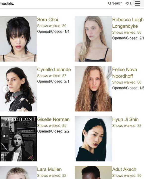 런웨이에 많이 서는 모델이 캠페인이나 잡지를 많이 찍는 건 아니고 반대로 캠페인이나 잡지를 많이 찍는다고해서 런웨이에 많이 서는 것도 아니다. 게임캐릭터의 스탯처럼 몇 개의 런웨이에 섰나, 몇 개의 캠페인을 찍었나, 몇 개의 잡지 화보를 찍었냐에 따라 종합적인 모델의 커리어는 평가되고, 해외 모델 시장에서 이 수치가 높은 이들이 진정한 “세계적인 탑모델”이라 불릴 수 있는 모델이다.