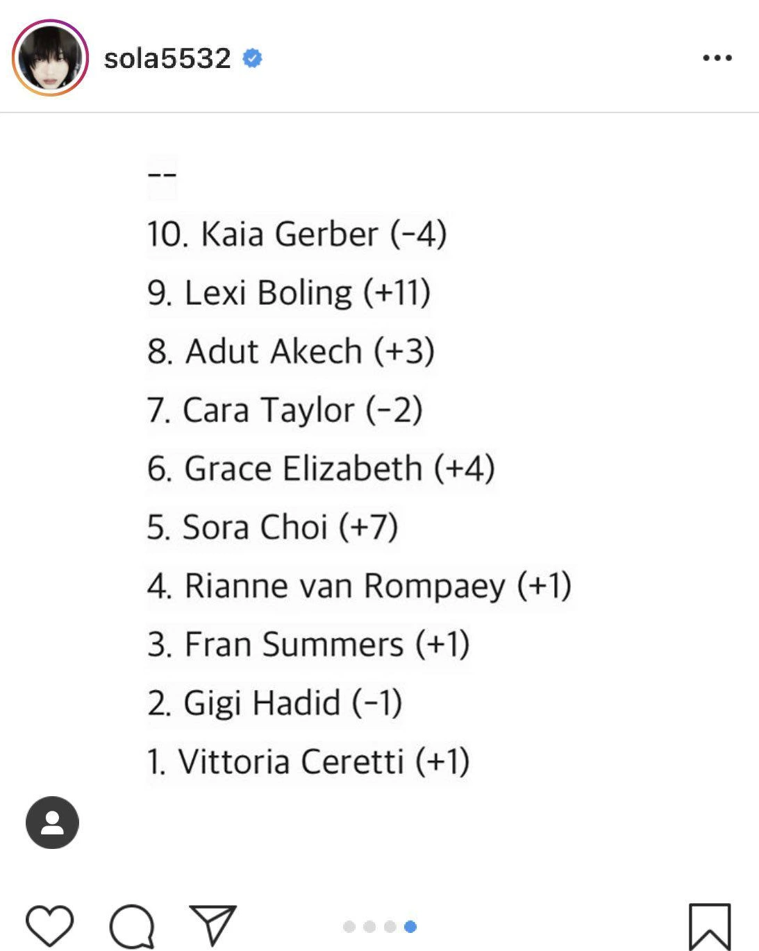 "탑모델", 혹은 "세계적인 탑모델"이란 수식어가 남발되면서 진짜 "탑모델"들이 커리어가 도리어 평가절하되기도 하지만 최소라는 진짜 세계적인 탑모델 맞다. 마치 모델계의 BTS, 모델계의 페이커 같은 존재다. 너도나도 누구나 쉽게 탑모델로 불리지만 대충 수치로만 따져도 해외 패션 시장에서 최소라는 의심할 여지없는 대한민국 모델 아웃풋 중 최고, 원탑이다. 모델스닷컴 모델 세계랭킹 5위. 무슨 말이 더 필요해?
