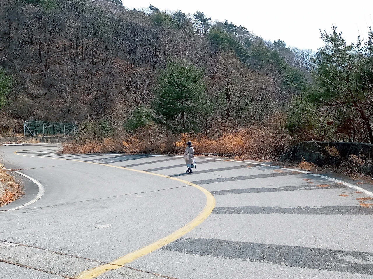 얼음길 앞에 주저앉아 오래 걸어온 열기를 식힌 뒤 우리는 돌아섰다. 다시 구불구불 길을 오르던 중 고갯길을 내려오는 차량을 한 대 만났다. 그럴 필요는 없는데 나는 굳이 손 신호를 보냈다. '갈 수 없어요, 돌아서 가세요.' 두 팔을 교차해 엑스자를 지어 보였다. 운전자가 속도를 줄여 창을 열었다. 동네 사람은 아니었지만 인근 주민으로 여겨지는 중년 남자였다.