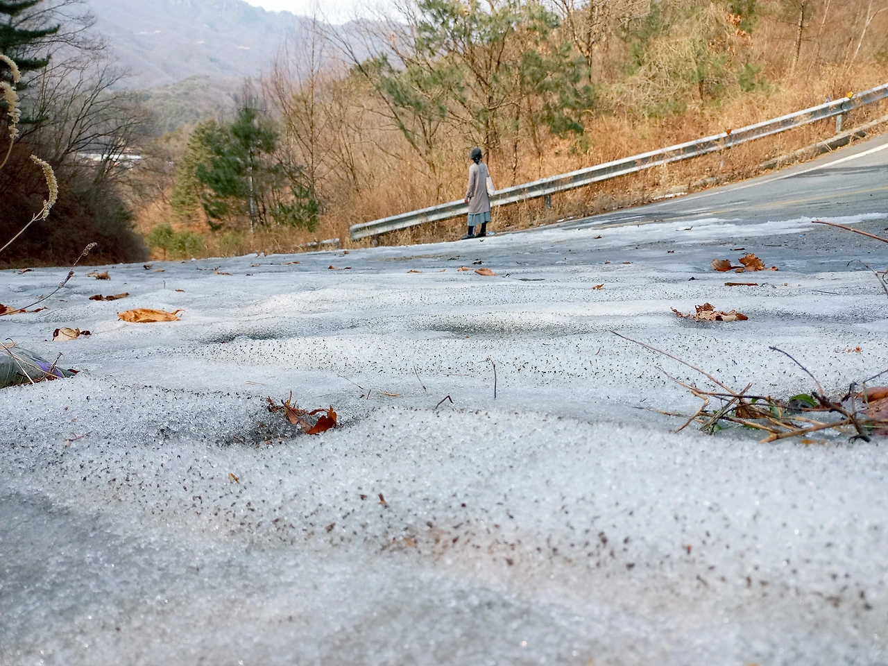 어제는 국도변에 이르는 그 가파른 길을 걸었다. 구불구불 도로를 한참 내려가다 멈칫 걸음을 멈췄다. 산 아래 그늘진 도로 가득 얼음이 덮여 있었다. 영상 10도가 넘는 기후에 얼음이 남아 있으리라곤 생각지 못했다. 어쩐지 그곳까지 가는 동안 만난 차량이 한 대도 없었던 것에 까닭이 있었던 것이다. 고갯길 입구에 통행금지 팻말은 없었다. 급경사를 달려 내려오다 얼음길 앞에서 돌렸을, 차량의 바퀴 자국이 여러 개 보였다. 넓은 산기슭 쪽으로 차를 돌릴 만한 여유가 있어 위험해 보이지는 않았다.