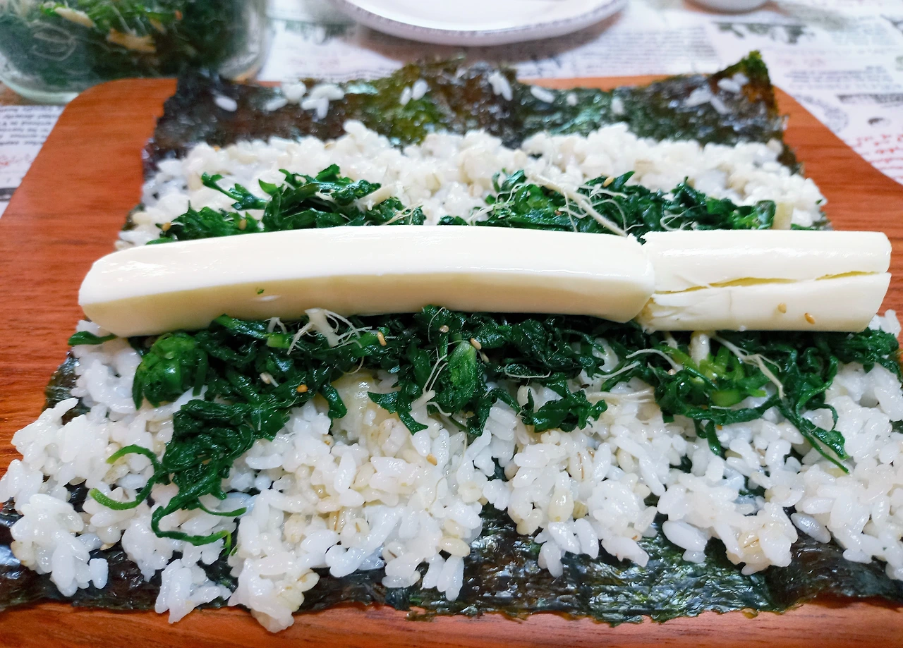 냉이 김밥을 해 먹기로 했다. 냉이 김밥 재료는 간단하다. 밥과 냉이와 두부만 있으면 된다. 두부가 없어 이번엔 스트링 치즈를 넣었다. 산골 사는 두 동생 먹을거리를 염려하는 언니는 자주 먹을 걸 택배로 보내온다. 단백질 섭취가 부족할까 싶어 빠지지 않고 보내오는 게 치즈다. 고마운 언니 생각을 하며 김밥을 말았다. 꽃피는 사월, 함께 봄 나무 아래서 향긋한 냉이 김밥을 먹으면 얼마나 좋을까.