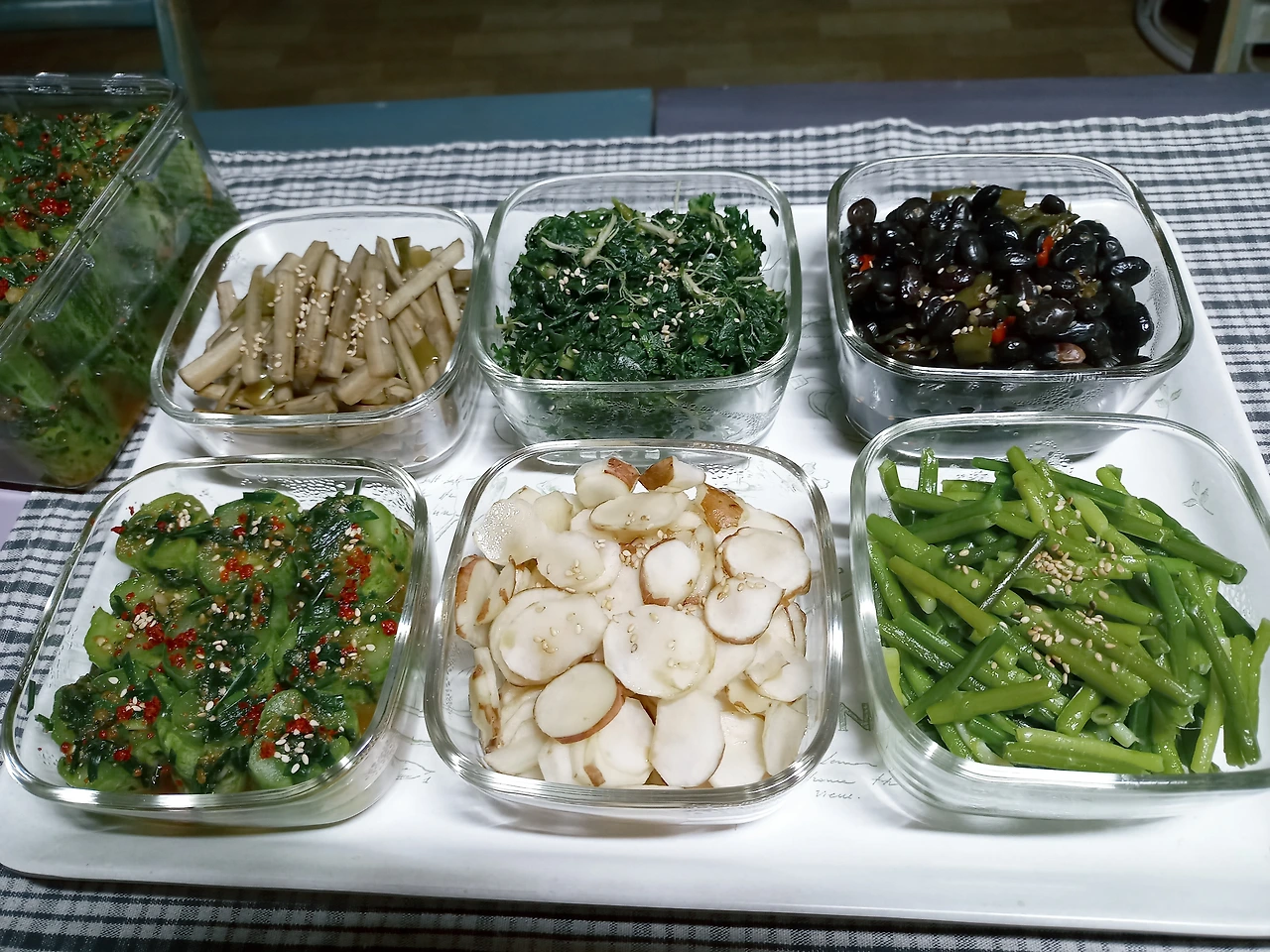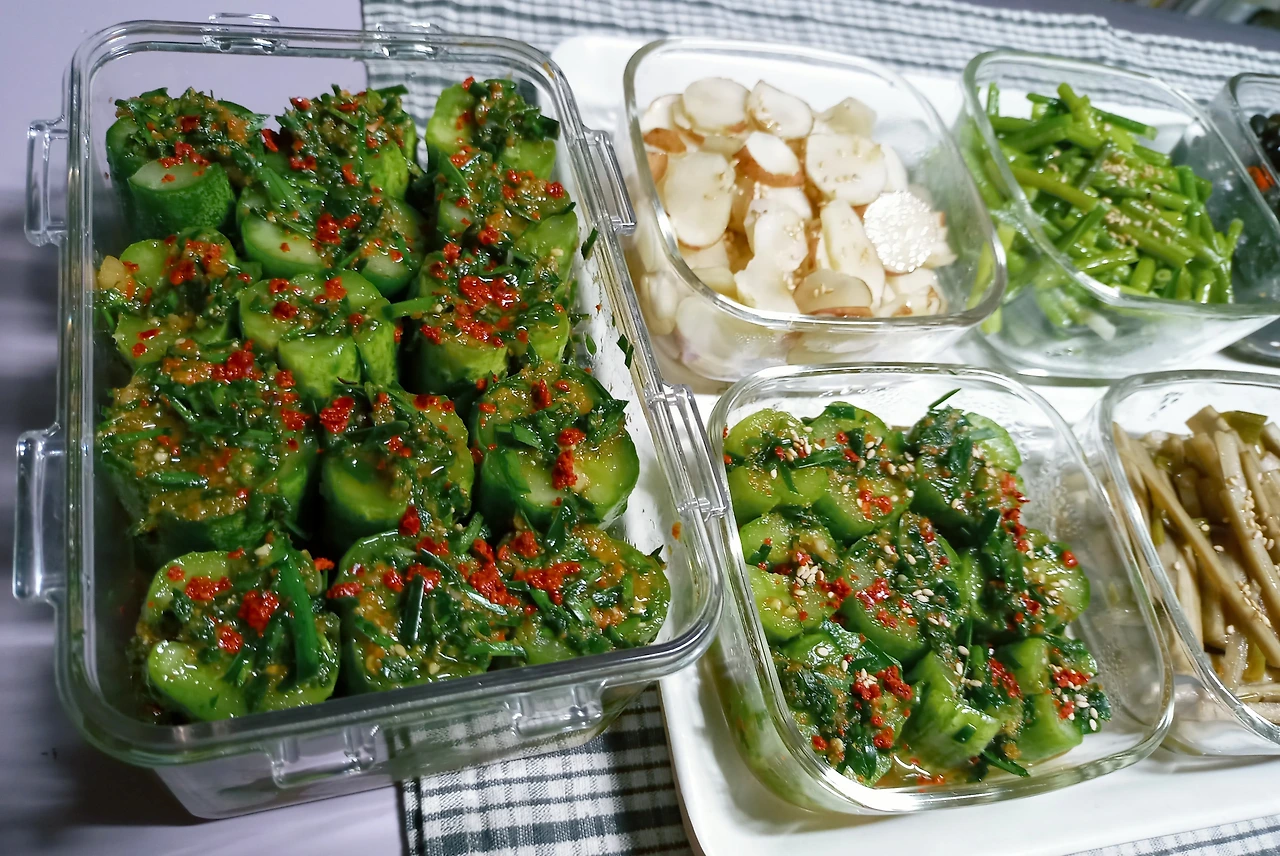 오이소박이-오이는 깨끗이 씻어 먹기 좋은 크기로 토막을 낸다. 오이 토막 한쪽에만 열십자로 칼집 내어 소금에 절인다. 소금에 절이는 동안 속에 넣을 소를 준비한다. 부추와 마늘과 생강, 홍고추를 잘게 다져 소를 만들었다. 간은 소금 2,설탕 1의 비율로 했다. 오이가 절여지면 손으로 꼭꼭 쥐어 물기를 짠 뒤 속을 넣어 반찬통에 차곡차곡 담는다.
