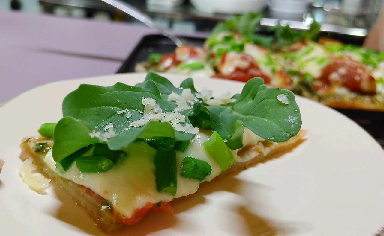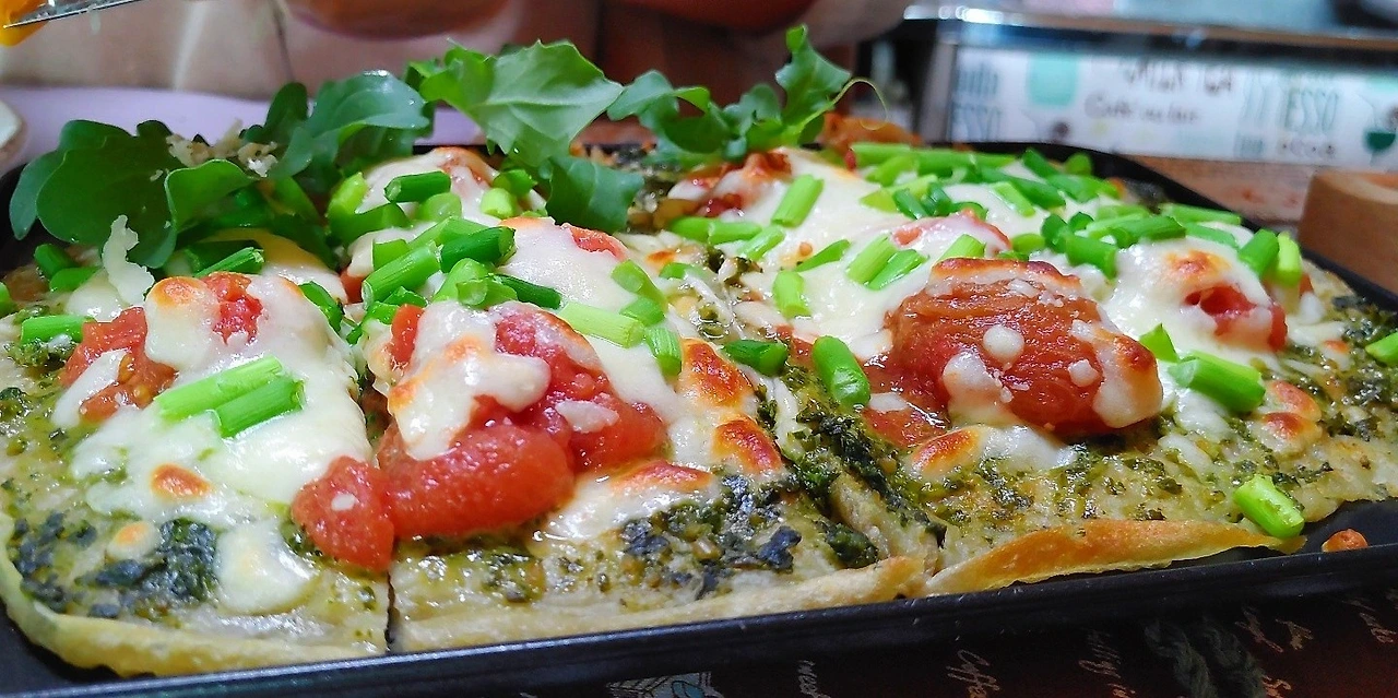 피자 도우(밀가루를 묽게 반죽해 건조 이스트를 넣어 발효시킨 뒤 부침개 부치듯 구운, 토르티야와 거의 흡사한 피자 도우다. 한꺼번에 몇 장 만들어 냉동해 두고 언제든 피자를 먹고 싶을 때 사용한다. 폭신한 도우를 원하면 식빵 두 장으로 대체해도 된다.)에 바질 페스토를 바른다. 그 위에 토마토를 얹고 피자치즈를 뿌린다. 오븐에 넣어 180도에 20분 정도 굽는다. *양파나 파, 마늘이 있다면 잘게 썰어 피자치즈 위에 얹고 구우면 좋다. 치즈와 섞여 구워지는 향 채소의 냄새가 무척 근사하고 맛도 월등히 좋아진다. *바질 페스토가 없을 경우엔 피자소스를 만들어 사용하는 것도 좋다. 마늘을 기름에 볶아 소금으로 간하고 토마토와 바질가루, 매운 고추를 넣어 졸이면 맛있는 피자소스가 된다.