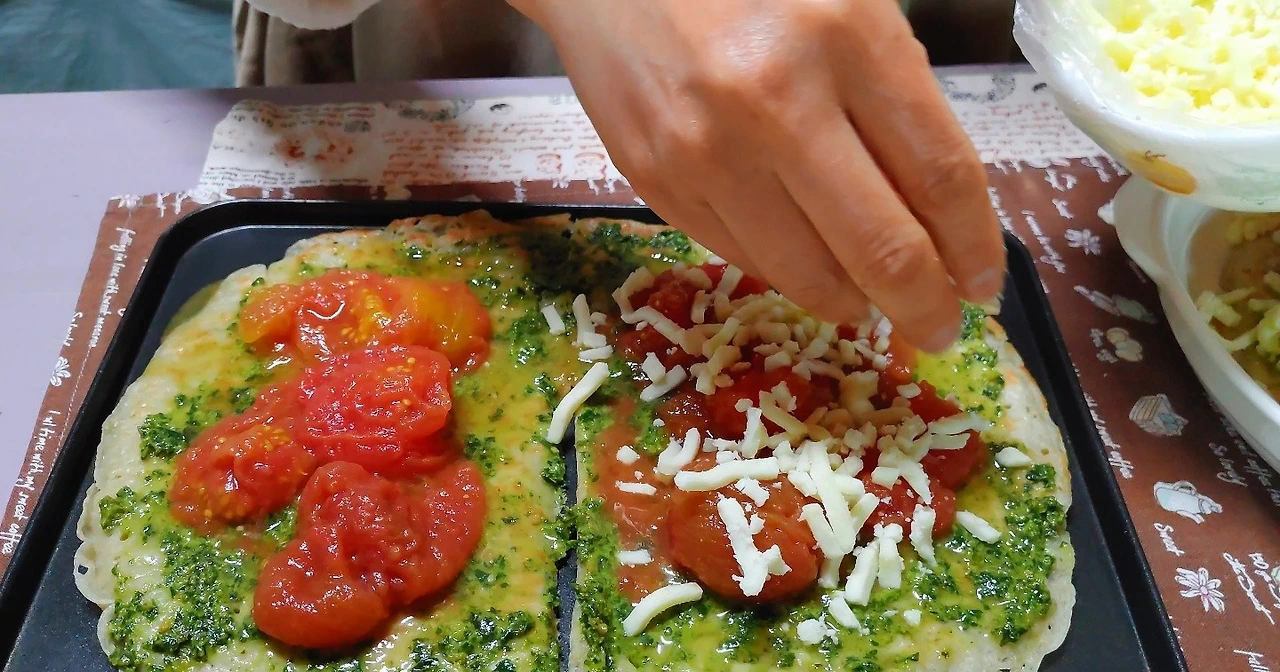 도우에 바질페스토를 바르고 홀토마토와 치즈를 얹는다