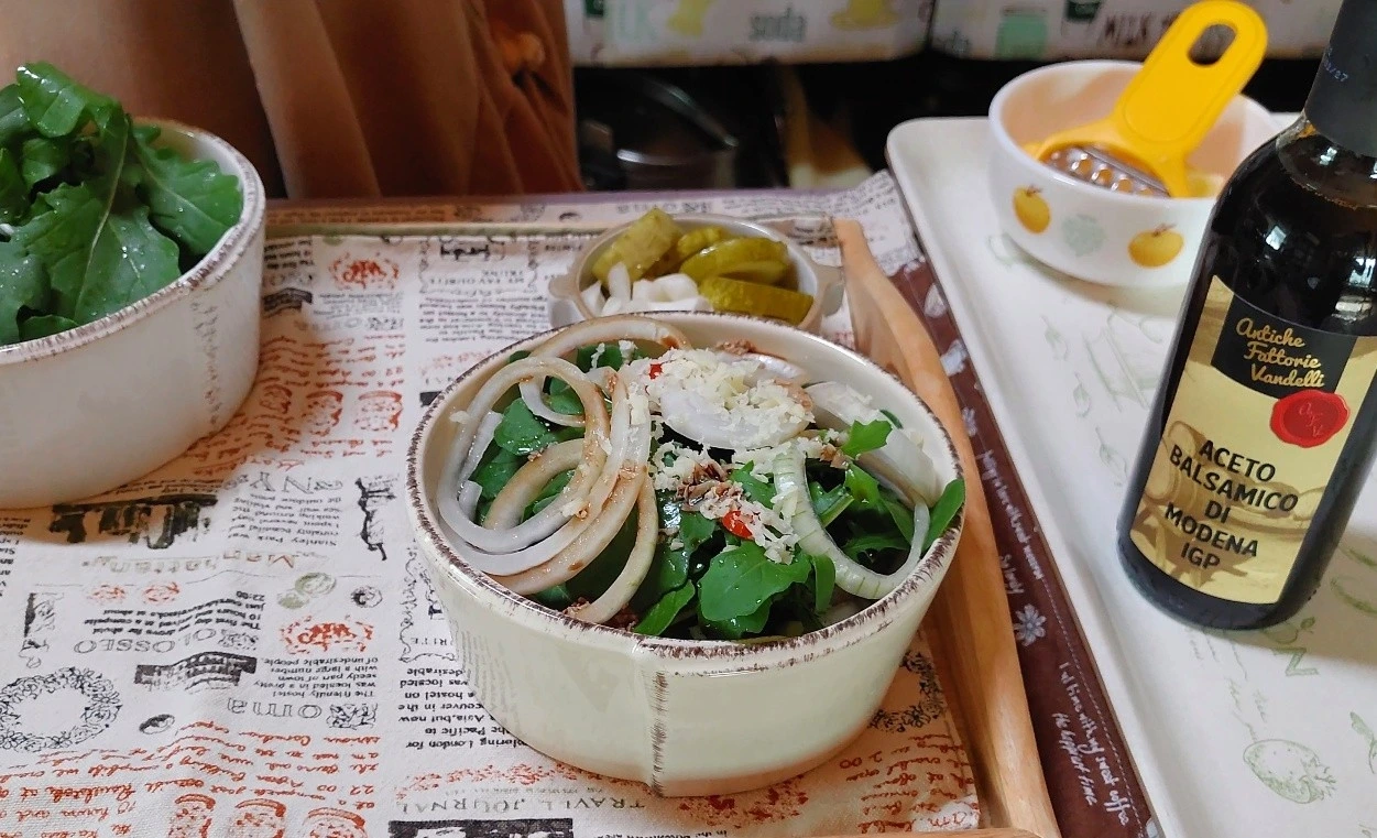양파를 썰어 단촛물(식초 1, 설탕이나 매실액 1, 소금 한 꼬집 비율)에 절인다. 깨끗이 씻은 루꼴라를 손으로 먹기 좋게 잘라 샐러드 그릇에 담는다. 절인 양파를 얹고 올리브유를 뿌리면 완성. 좀 더 근사한 샐러드를 원한다면 치즈(고다나 에멘탈 종류)를 갈아 얹거나 발사믹 소스를 뿌린다.