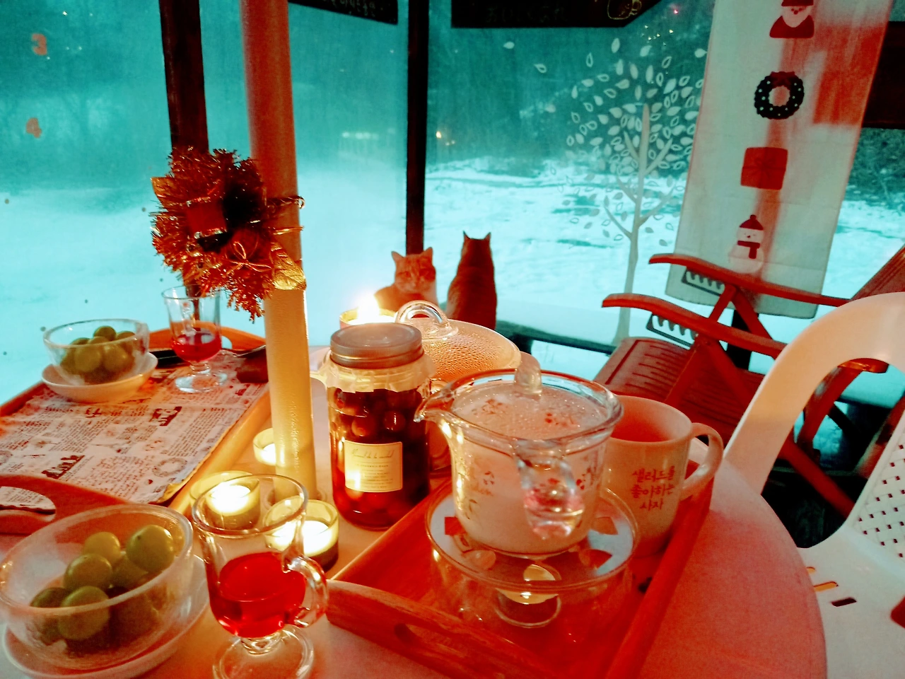 올해도 연말이 다가오자 동생이 마당 고양이들과 테라스에 트리 장식을 했다. 테라스는 고양이들 영역이라 허락을 구해야 한다. 반짝반짝 불빛이 고양이들도 싫지 않은 눈치였다. 하얀 눈이 쌓인 마당을 배경으로 반짝거리는 불빛이 엔딩곡처럼 흘렀다. 마무리엔 불빛이 필요하다. 올 한 해 일상의 기쁨과 슬픔, 고통, 충만, 평안, 공허를 반짝이며 섞어준다. 어느 하루도 나쁘지 않았다고. 모두 신비로웠다고. "너와 함께한 시간 모두 눈부셨다. 날이 좋아서, 날이 좋지 않아서, 날이 적당해서 모든 날이 좋았다"*라고 도깨비도 말하지 않았던가. 크리스마스엔 눈이 또 내렸다. 이따금 먹구름 사이로 볕이 나서 눈도 반짝반짝, 집안엔 장작불이 타닥타닥.