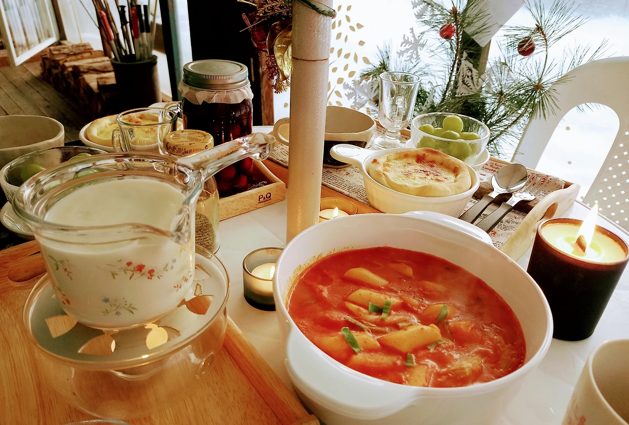 2023년이 이제 얼마 남지 않았다. 어제는 테라스에서 동생과 고양이들과 산골 연말 파티를 했다. 고양이들을 위해 동생이 노가리를 굽고, 나와 함께 먹을 떡볶이도 만들었다. 나는 냉장고에서 며칠 저온 숙성시킨 반죽으로 겨울빵을 구웠다. 감자와 양파, 당근, 버섯, 치즈가 듬뿍 들어간다. 고소한 겨울빵과 매운 떡볶이는 산골 연말 파티 고정 메뉴다.