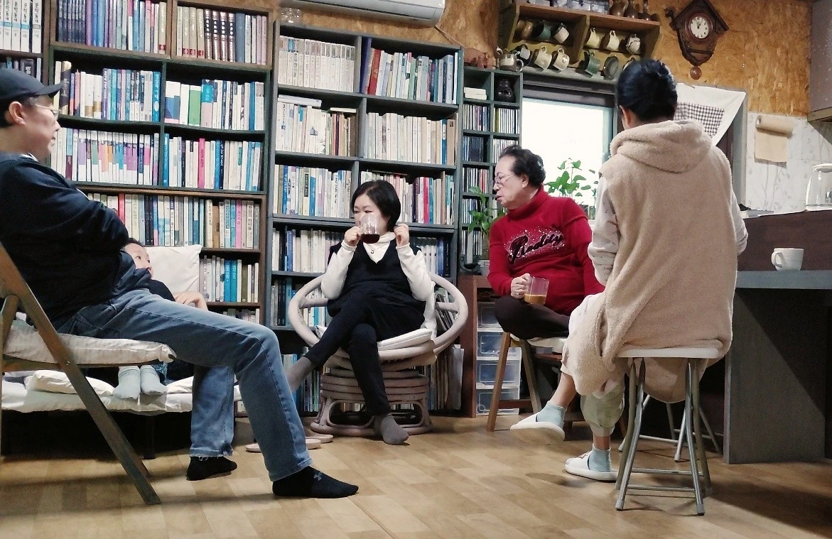 식사 후 커피 타임. 남동생, 언니, 엄마, 여동생.