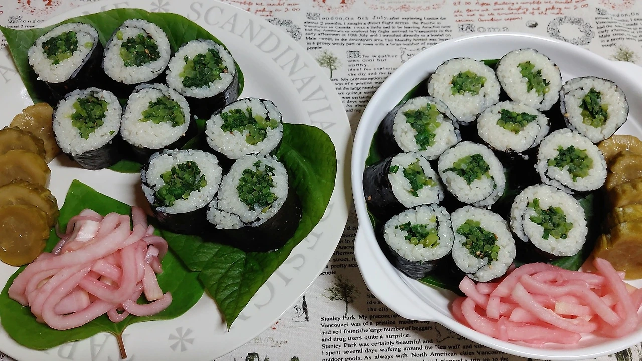나무도마에 김을 놓고 참기름과 소금으로 간한 밥을 얇게 편 뒤, 개망초 무친 것을 듬뿍 올렸다.