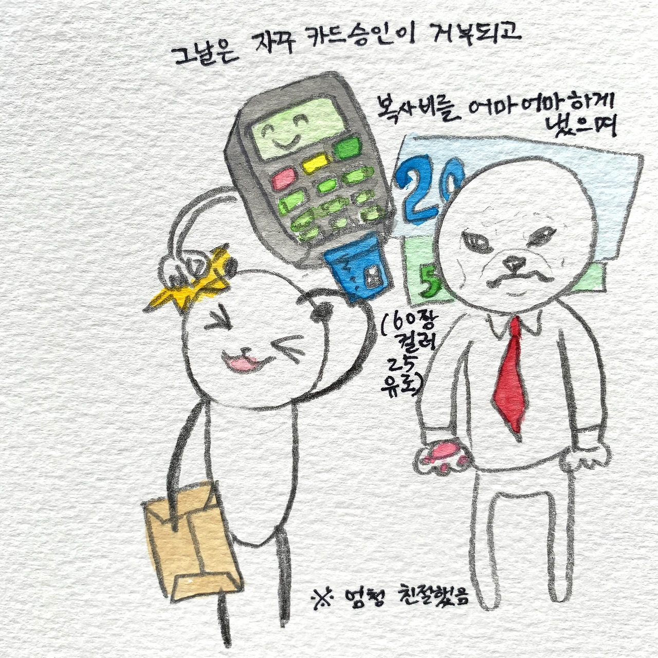 오늘은 6월 11일 목요일이다. 원래는 경시청에 가서 체류증을 갱신해야 하는 날이나 코로나 때문에 취소되었다. 글을 쓰는 지금은 아홉시가 다 되어가고 있다. 나는 기분을 나아지게 만들기 위해 뭐라도 해야 할 필요성을 느꼈기 때문에 저녁을 먹은 후에 나가서 레몬을 두개 사왔고 콜라도 사온 후 집에 있던 멜론 리큐어로 미도리 사워를 오백잔에 낭낭하게 말아서 전부 마셨다. 오늘의 시작은 꿀렁꿀렁거리는 배였다. 나는 아침부터 화장실을 들락날락했는데 크게 긍정적인 성격이라고는 못 해도 요즘 생활 리듬이 크게 나쁘지도 않았던 탓에 이게 오늘 하루의 예고편일거라고는 생각하지 않았다. 경시청에는 난생 처음 가는지라 한껏 긴장을 해서 열심히 전투화장을 했고 옷도 신경썼다-다니엘은 그럴 필요 없다고 했지만-. 서류는 원본과 사본을 모두 빈틈없이 준비해야 했기 때문에 전투화장을 마친 후에는 복사를 하러 갔다. 총 30장이 좀 넘는 서류들을 두 부씩 복사해야 했다. 한 부는 보존용으로 집에 남겨놓기 위함이었고 한 부는 사본으로 제출해야 했기 때문이다. 컬러복사라 가격이 좀 나갈 거라는 생각은 했지만 25유로가 나왔을 땐 조금 놀랐다. 나올 수 없는 금액은 아닌데 다른 복사집보다는 확실히 비싸다. 이래서 발품을 팔아야 하나보다 했다. 카드로 지불하려니 어제도 떴던 'paiement refusé(지급 거절)' 메세지가 리더기에 뜬다. 카드 한도는 앱으로 확인을 했기 때문에 한도 때문은 아니다. 은행을 방문할 이유가 하나 더 늘었다. 이때까지도 뭐 충분히 있을 수 있는 일들이 겹친 것에 불과했다. 기분이 나쁠 것도 없었다. 지갑에 있던 비상용 현금으로 돈을 냈다. 그리고 집으로 돌아왔다. 돌아오면서 샤리오, 바퀴달린 장바구니로 내 앞을 걷던 여자들을 퍽 치고 지나가는 백발의 할머니를 봤다. 할머니가 여자들한테 소리를 질렀다. 왜 와서 부딪치느냐고. 여자들은 할머니더러 먼저 쳤다고 뭐라 했다. 나도 봤다고 한마디 보태고 싶었는데 우물쭈물하다가 집에 왔다.