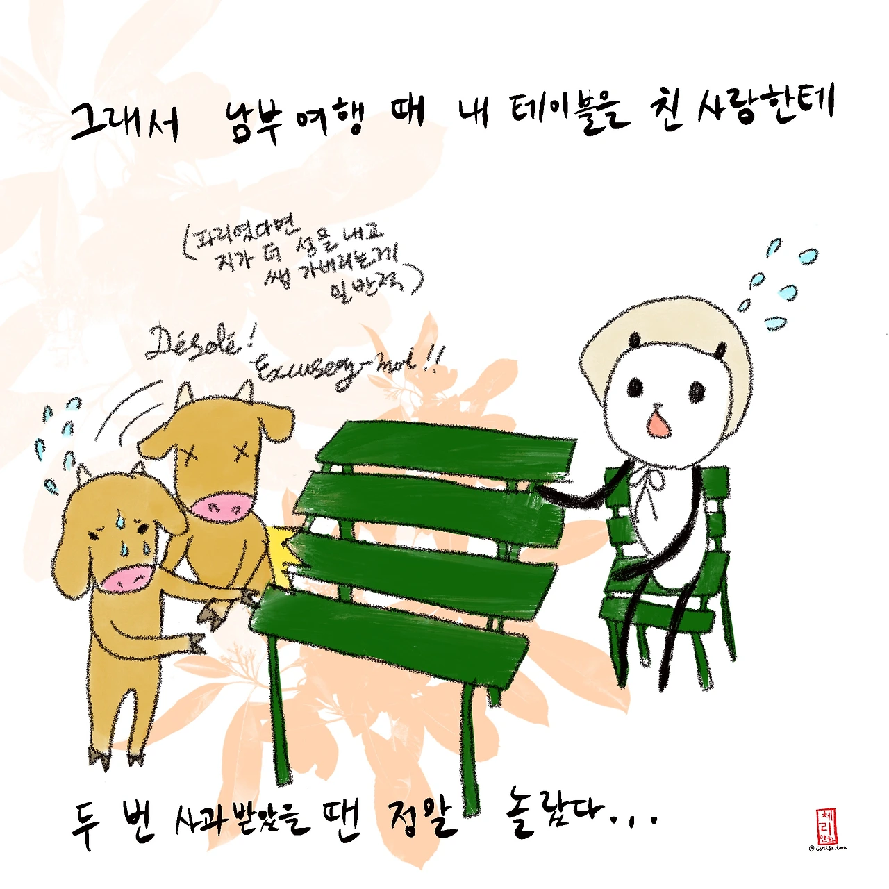 다행히 다음날은 혼자 거동할 수 있을 만큼 좋아져서 다니엘이 체크아웃을 하는 동안 호텔 앞 테이블에 앉아있었다. 누군가 내 테이블에 부딪히길래 그냥 지나가겠거니 하고 앉아있었는데 그 사람이 내게 미안하다고 두 번이나 사과하며 지나가는 게 아닌가. 이것 또한 파리에서는 기대하기 정말 힘든 일이다. 내가 걷다가 멈췄다는 이유만으로 쇼핑몰이나 거리에서 뒷사람한테 프휴~~~ 하는 한숨을 듣는 파리인 걸(3년 동안 네 번 경험했다. 나는 자주 나가지 않는 사람이다). 파리라면 제가 와서 내 테이블에 부딪혔어도 되려 더 성을 내거나 쌩하니 지나가는 게 일반적이다. 사과라니!! 다니엘이 오길래 무슨 일이 있었는지 얘기했더니 다니엘도 놀랐다.