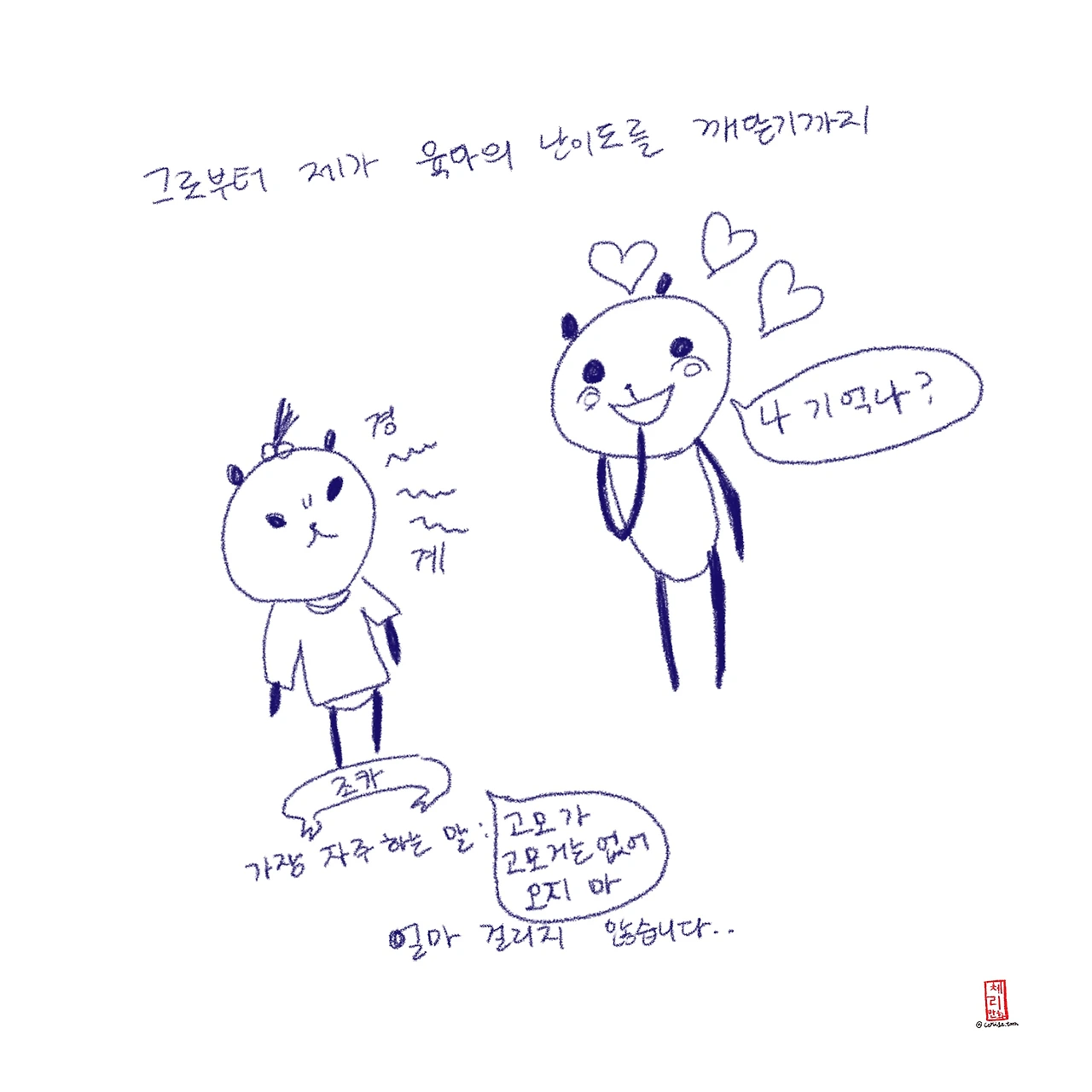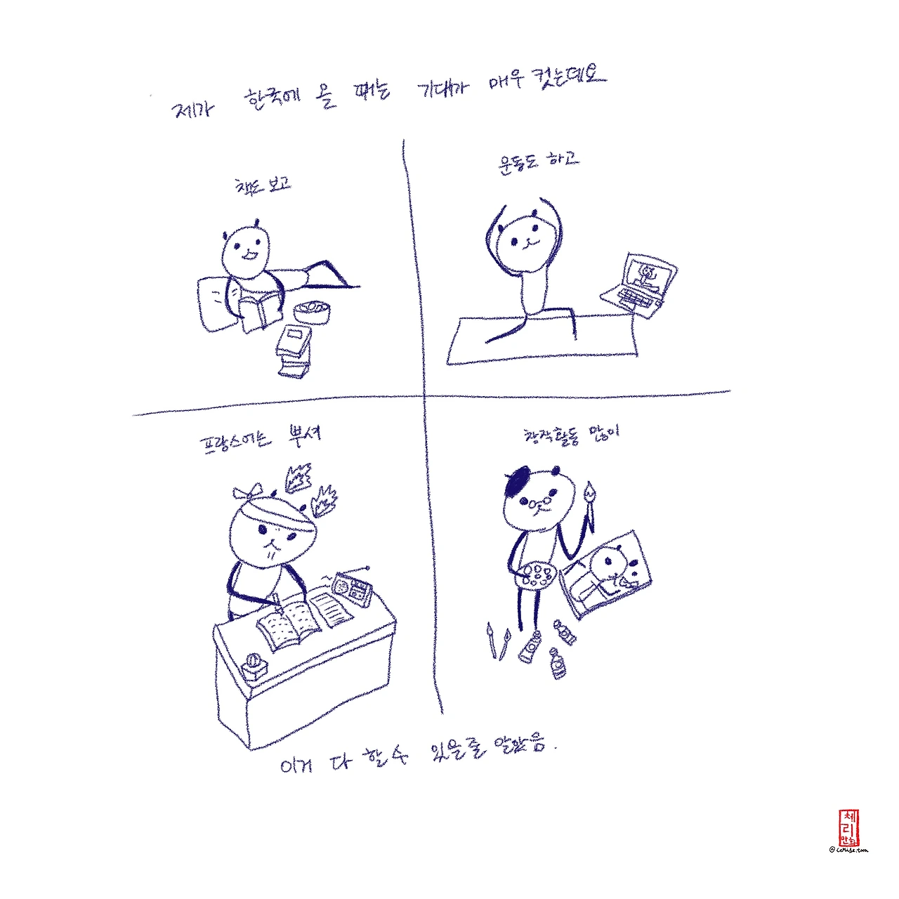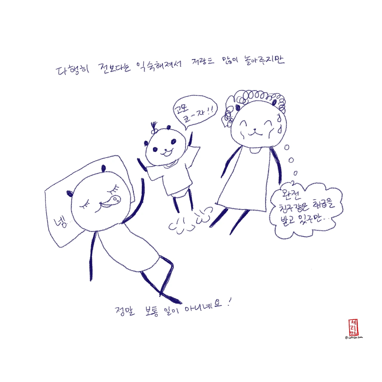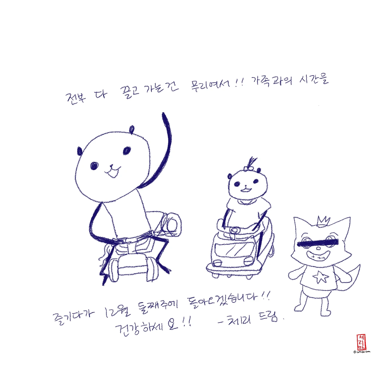 이번 휴재는 정말 오랜만에 온 한국과 조카와의 생활, 가족과의 시간을 즐기고 쉬는 시간을 가지려구요. 맛있는 것도 많이! 위장에 담아가겠습니다. 헤헤 여러분과 함께하는 시간이 무척 즐겁기 때문에 쉬는 동안에도 (주로 인스타: @cerise.toon 계정으로) 다른 채널 통해 뭐 하고 사는지 근황 올릴게요! 그리고 12월 둘째주에 돌아오겠습니다. 지금은 비수기 툰이라고 채색 안한 인스타툰을 올려볼까 생각중인데 애플펜슬이 조카 눈에만 띄면 손에 잡혀 바닥에 찍히는 무자비한 대우(보통 이럴 때는 뺏어버리는데 너무 놀란 나머지 뺏지도 못하고 보고있었답니다) 를 받고 있기 때문에 현실성이 있는 계획인지는 잘 모르겠어요!
