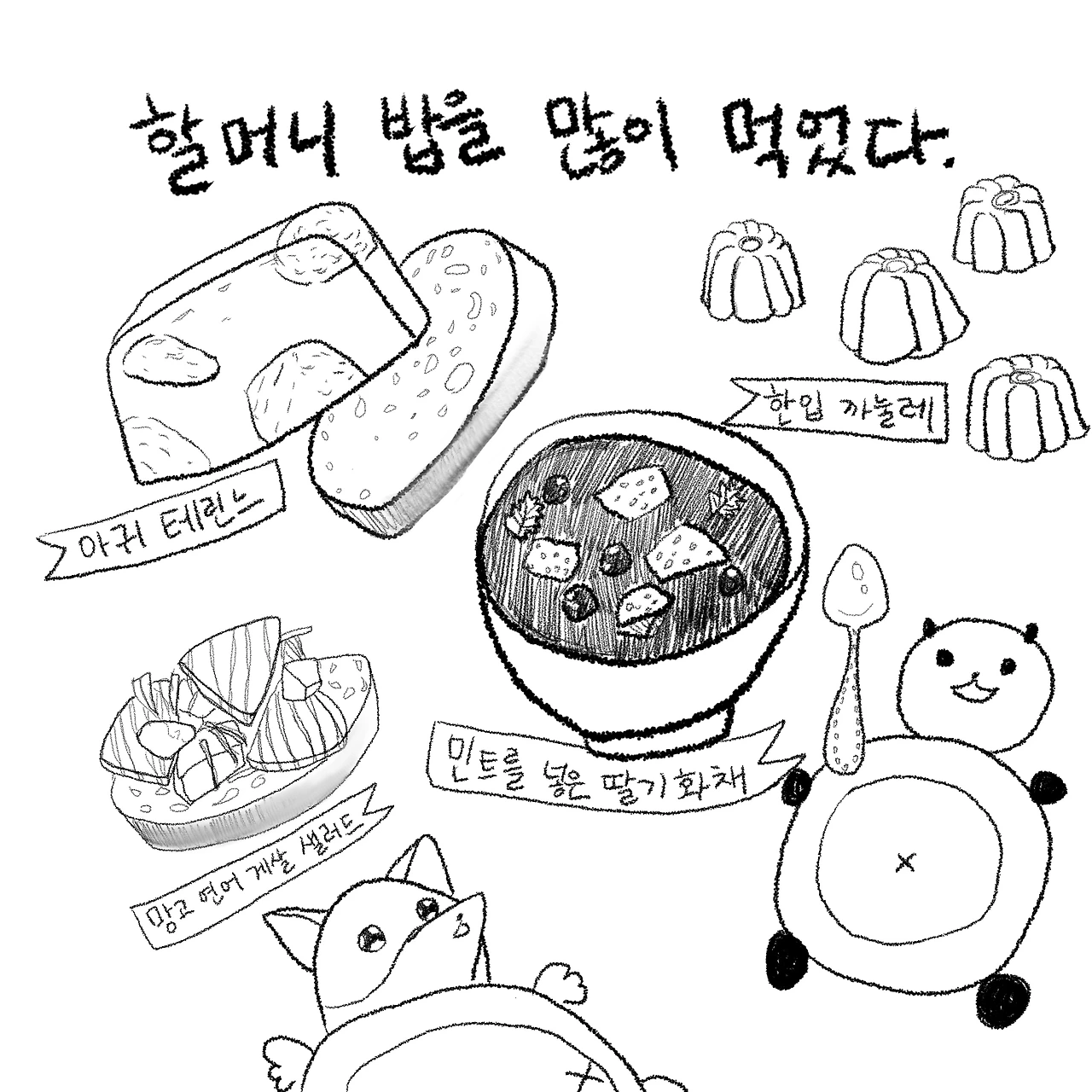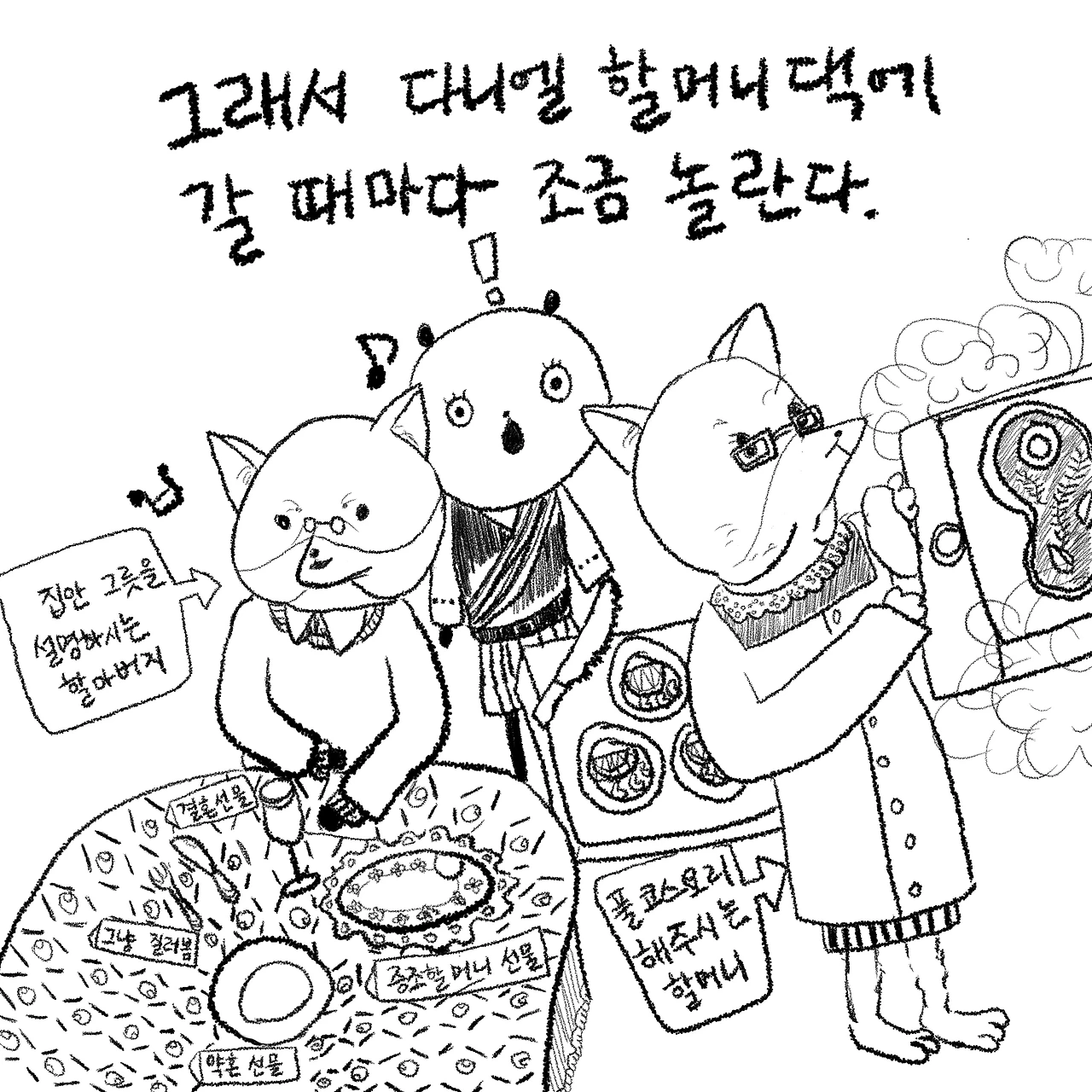 얼마 전에야 깨달았다. 나는 할머니의 손맛 같은 걸 모르는 사람이라는 사실을! 물론 할머니 댁에 내려가면 떡집에서 쪄온 술떡이나 제사 음식 같은 건 먹어봤다만 그건 사온 음식이고, 제사 음식은 할머니가 하는 법이 없었다. 결국 돌고 돌아 큰엄마 아니면 우리 엄마 손맛이었다. 외할머니는 이미 연세가 너무 많으셔서 차마 할머니가 잘 하신다던 가자미 식해 해달라고 조를 상황이 아니었다. 게다가 외가에는 뭘 얻어먹을 만큼 오래 머물렀던 적이 없다. 끽해야 반나절이었으니. 가장 먼저 떠나는 집은 늘 우리집이었고. 그게 못내 불만이었다. 그나마 이쁨받는 친척집이 외가인데 좀 놀만 하면 아빠가 흥을 깼다. 삼촌이 장을 보시고 숙모가 음식을 해주셨지만 할머니 손맛은 모른다. 아예 싹 모르는 분야이다보니 지금껏 부럽다는 생각도 잘 한 적이 없다. 영혼 없이 좋겠다, 정도만 생각했다. 그래서 다니엘을 만날 때마다 그가 그렇게 칭찬하는 할머니의 손맛이 뭔지, 이 미지의 분야에 대해 아는 맛을 총동원해서 상상했었다. 처음 다니엘의 외할머니와 외할아버지에게 볼을 맞대어 인사했을 때, 티내지 않으려 부단히 노력했지만 깜짝 놀랐었다.나이든 사람들의 피부를 만져보는 게 너무 오랜만이었다. 조금 건조하고 약간 오돌토돌한 피부였다.