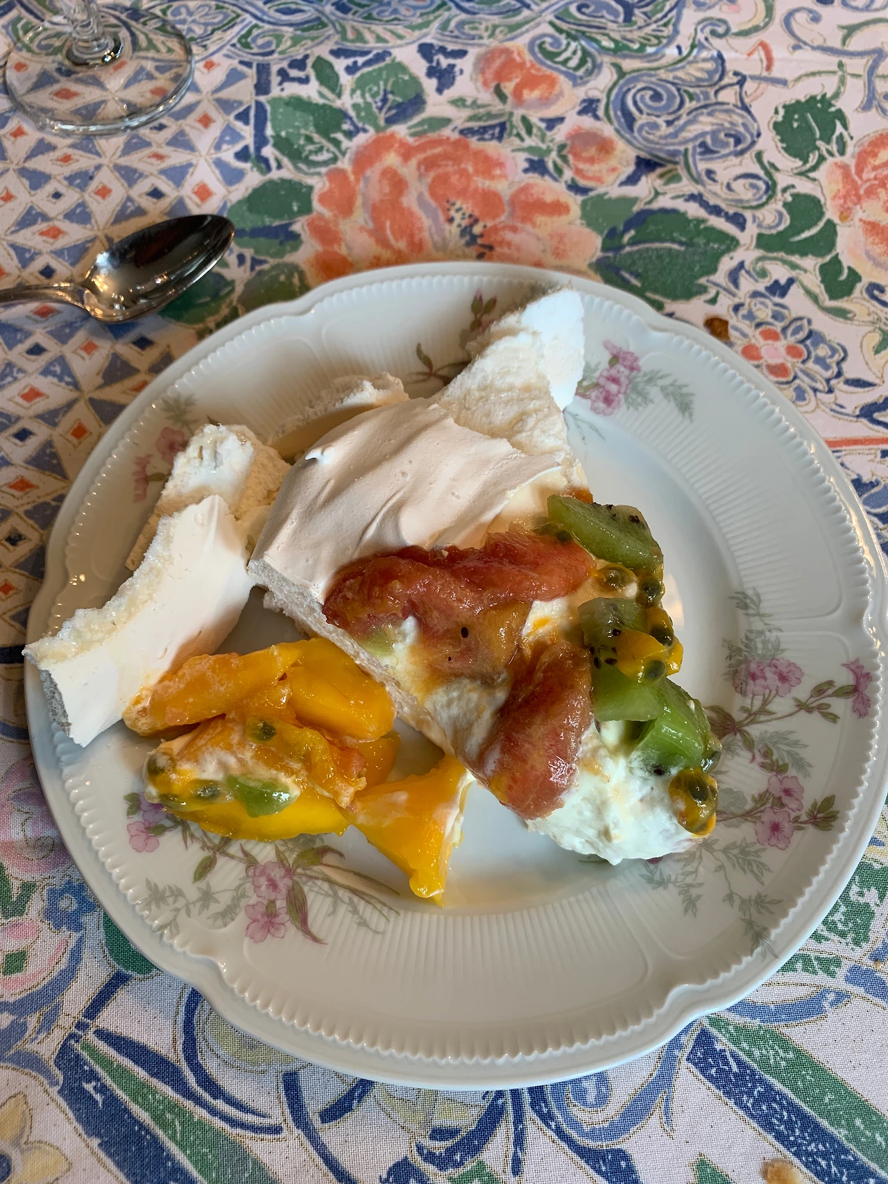 패션, 복숭아, 망고를 올린 머랭 케이크
