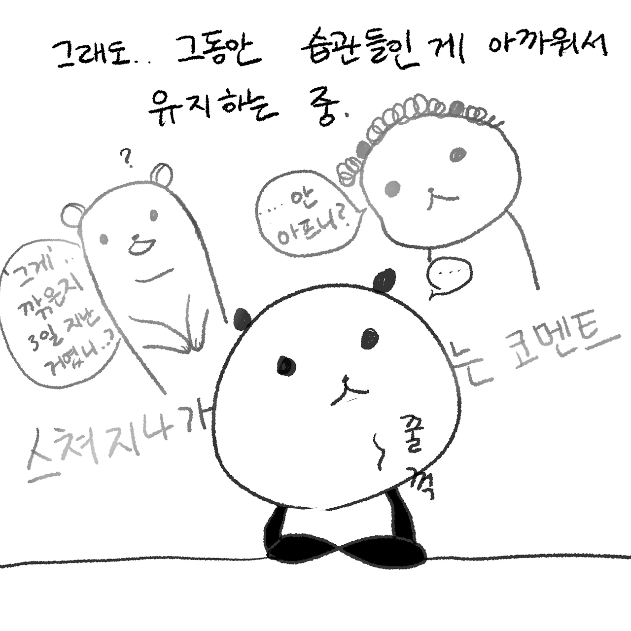 오래 사귀다 보면 둘 사이에서만 통하는 별명이나 농담이 여럿 생기기 마련이다. 그중 하나로 우리는 서로를 핑구라고 부르는데 예전에 설거지를 하다가 패트와 매트 아니면 핑구에 나올 법한 몸개그를 선보인 적이 있어서 그렇다. 그래서 아무것도 없는 데서 넘어지거나 어이없이 뭘 쏟거나 할 때 오... 핑구..라고 하는데 나나 다니엘이나 그럴 때가 꽤 있기 때문에 이 핑구라는 별명을 기조로 하여 '피티쿱(Pingu Takes Care Of Other Pingu: 핑구는 다른 핑구를 돌봐준다)'과 '하나의 두뇌는 두 개의 핑구로 이루어진다' 등의 이상한 격언을 만들기에 이르렀다. 이 핑구 붐이 꽤 오래가면서 내 에어팟을 살 때 핑구 각인을 할 수 있나 알아보기도 했는데 아쉽게도 핑구를 닮은 이모티콘이 없어서 실패했다. 오래된 캐릭터라서 그런지 케이스도 마음에 드는 게 없어서 아쉬웠던 기억이 남아있다. 우리가 심심하면 내뱉는 피티쿱이라는 말처럼 사귀는 기간 동안 우리는 크거나 작은 영향들을 많이 주고받았다. 다니엘은 조금 더 잘 자게 되었고, 음주나 흡연 습관 같은 부분도 바뀌었다. 그리고 나 같은 경우 사람이 좀 온순해졌고 화가 날 때 그냥 화를 내기보다는 대화를 시도하는 시간이 더 길어졌다.