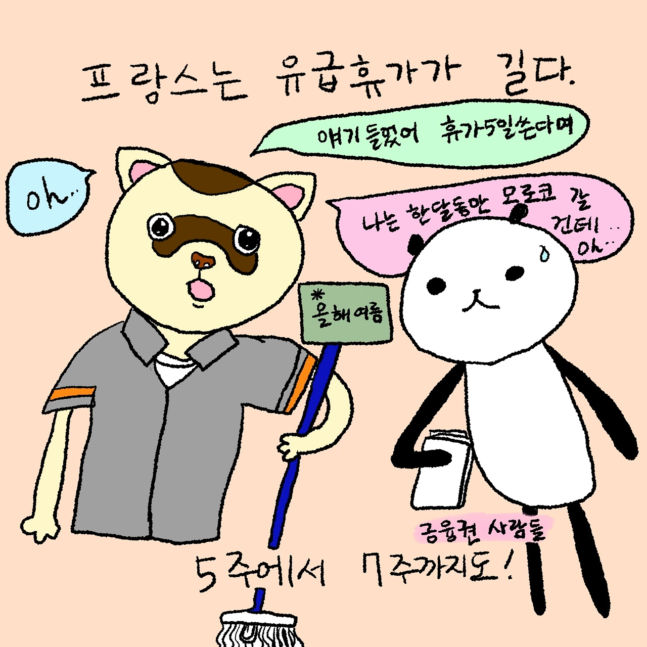 내 안에서 프랑스라는 나라는 노동자 권리의 황제 정도 되는 위치를 차지하고 있었기 때문에, 그렇게 오래 일해본 것도 아니면서 멋대로 CDI(정규직 개념)와 CDD(계약직) 이외의 계약은 없지 않을까 생각하며 살았다. 올해 (이미 그만둔)일을 시작하기 전까진 말이다. 나는 7개월의 계약직이었는데, CDD는 업무 기한이 정해진 계약직이면서 유급 휴가가 보장되는 반면 내 계약인 앙떼림(intérim)은 유급 휴가가 보장되지 않고 쉬면 쉬는 만큼 월급이 깎인다. 병가는 또 다르다고 하더라만 아직 쉬어야 할 만큼 아팠던 일이 없어 확인할 기회가 없었다. 앙떼림(intérim)이라고 하더라도 이 고용 불안정성을 나중에 금전적으로 보상받는다는 것-나는 7개월을 일했지만 계약 기간을 마치고 나면 앙뎀니떼 프레꺄리떼(indemnité précarité)라는 명목으로 보너스를 받는다. 이 돈을 받는 것은 CDD 계약도 마찬가지인 것으로 알고 있다. 물론 계약에 따라 금액에 차등은 있을 것이다-이 한국에서 계약직으로 일했던 시기와의 차이라고 할 수 있을 것 같다. 즐겁게 일하긴 했지만 퇴직금은 애초에 기대조차 안 했으니까.