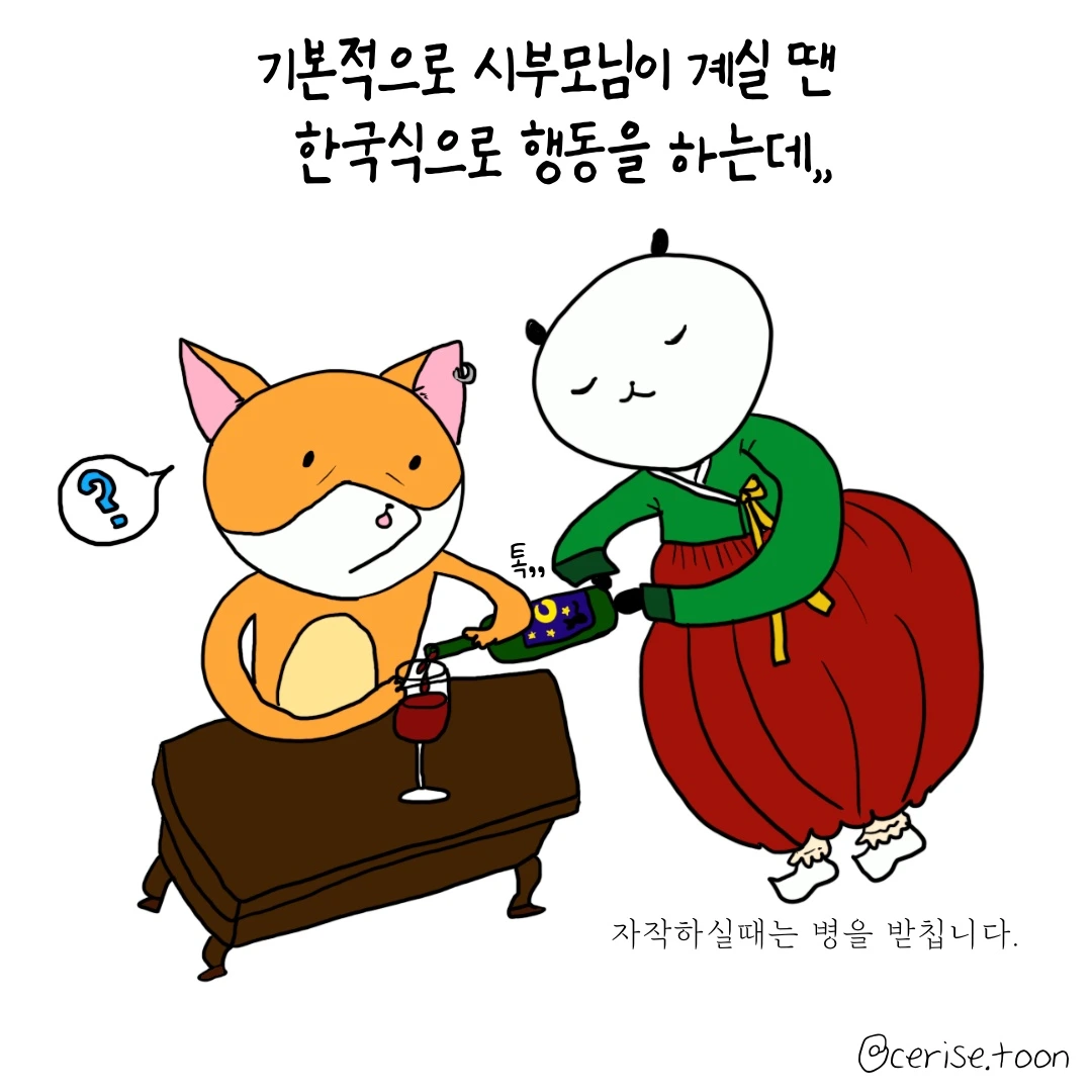 나는 한국의 뼈대 있는 집안 출신은 아니지만 평생을 한국에서 살아온 만큼, 또 지금 프랑스에서 살고 있다고 해도 지금까지 가져온 버릇이 몇 년 만에 사라지는 것은 아니므로 어른들을 대할 때는 아무 생각 없이 한국서 하던 대로 행동하고 있다. 뭔가를 건넬 때 두 손으로 받치거나, 날붙이는 내 쪽으로 향한 채 건네거나, (나보다) 어른이 술을 자작하면 병 바닥을 살짝 받치거나, 와인을 두 손으로 따르거나 하는 따위의 일들 말이다. 이것들은 몸에 밴 버릇이고 프랑스에서 이것들을 한다고 해서 대단한 오해를 사는 일은 없지만 한국에서 이것들을 안 하는 날에는 제법 상놈이 되는 수도 있기 때문에 앞으로 이곳에서 몇 년을 산다고 한들 고칠 생각은 전혀 없다. 그런 고로 내가 시부모님이나 다니엘 조부모님을 Vous라고 부르는 것은 정말 무의식적으로 나오는 말이다.
