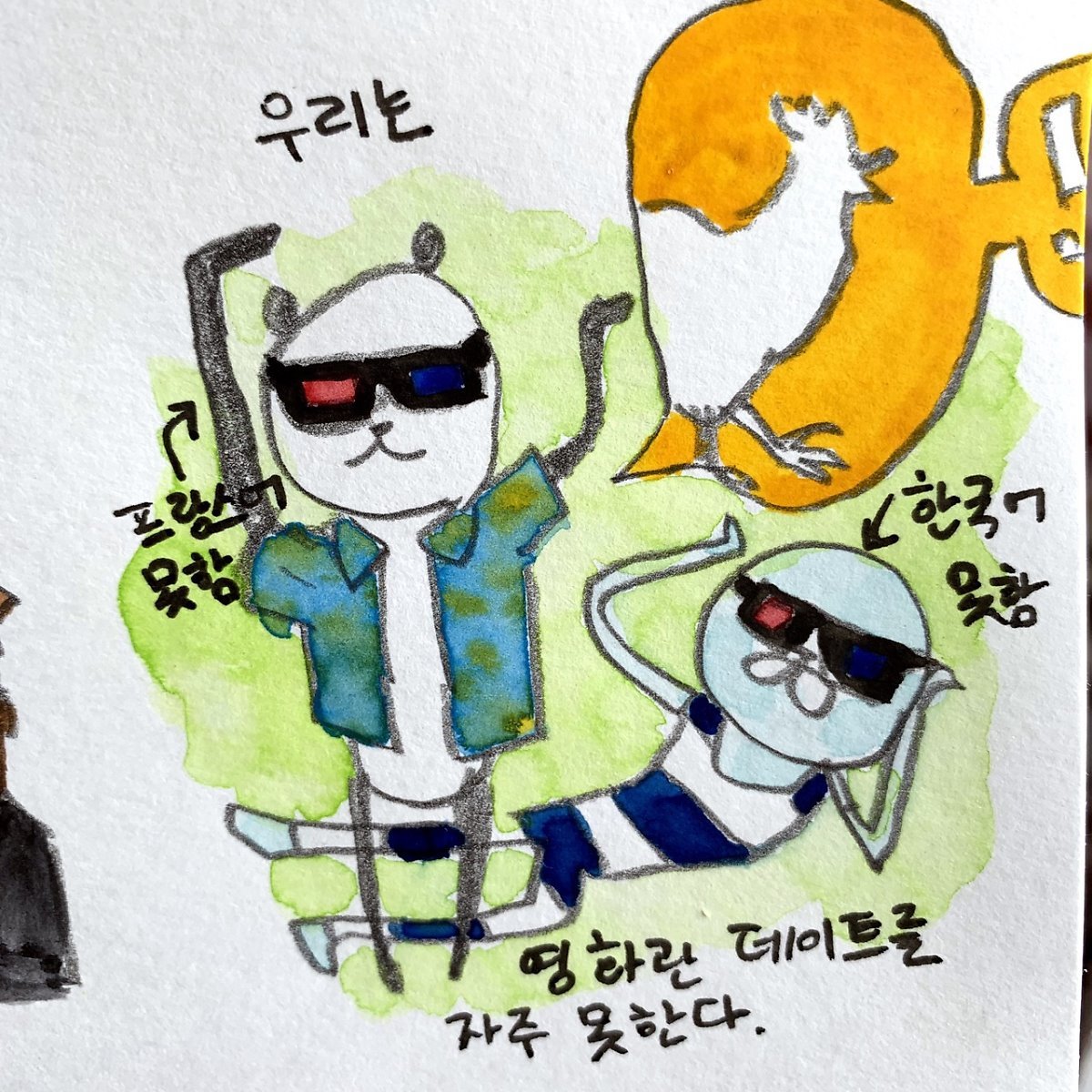 프랑스로 오기 전까지 외국에 살아 본 경험이 없는 나는 장을 보거나 집에서 동거인과 이야기를 나누거나, 업무 시간에 농담 따먹기를 할 때마저도 모국어를 쓸 일이 없다는 상황의 피로를 겪어볼 기회가 없었다. 이는 마치 생활 속의 백색소음처럼 의식하지 못하는 동안 조용히 깔리는 피로였다. 하루 종일 매고 다니던 가방을 집에 와서 내려놓았을 때 비로소 그 무게를 의식하듯이. 이 피로에 대한 보상 심리 때문인지 첫 프랑스 생활 때는 무조건! 내게 더 편한 언어로 제공되는 매체로만 여가 시간을 보냈다. 한국어 아니면 일본어로. 그러다 보니 우리 커플은 매일 일이 끝나면 서로의 옆에 앉아 각자 할 일을 하는 파워 개인주의형 생활을 하게 되었는데, 모처럼 함께 살게 된 마당에 이건 좀 아니다 싶었다. 결국 어느 순간부터 영어 자막을 단 영화와 드라마를 보기 시작했다. 여가시간에 영어 자막이라니... 여가시간에 영어 자막이라니!