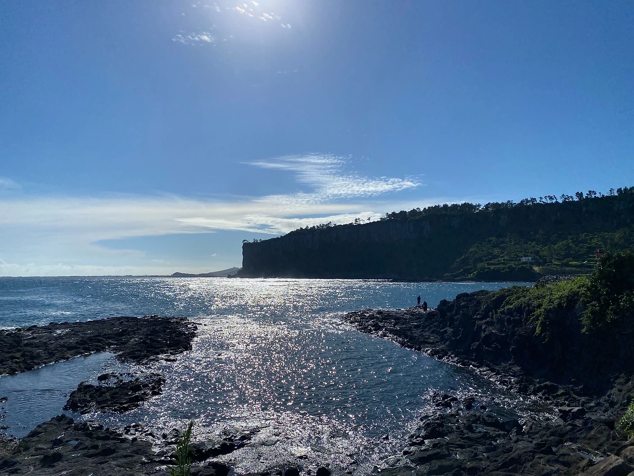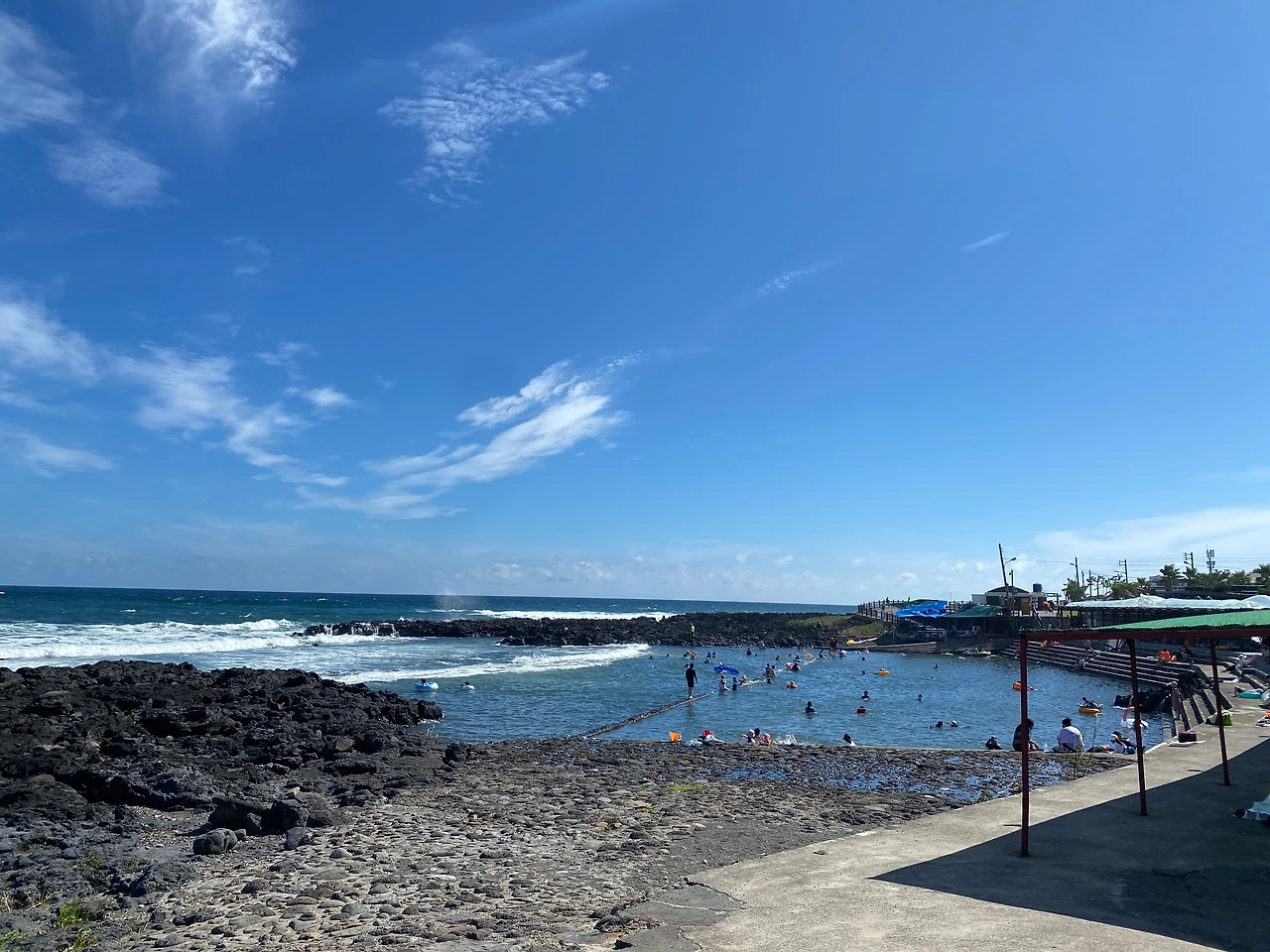 16km 지점 논짓물에 닿으면 시원한 해안 올레가 시작된다. 논짓물은 바다 가까이에 위치한 논에서 나는 물이란 뜻을 담고 있다. 민물로 만들어놓은 담수욕장이지만 파도가 계속 밀려들어와 짠맛도 느껴질 것 같았다. 많은 사람들이 즐거운 시간을 보내고 있었다.