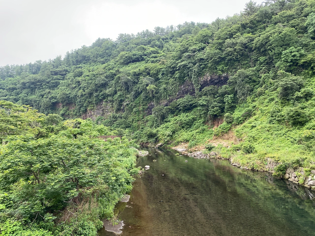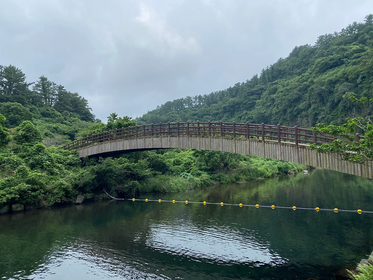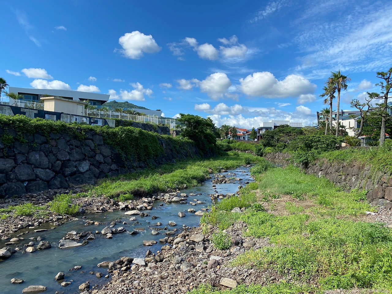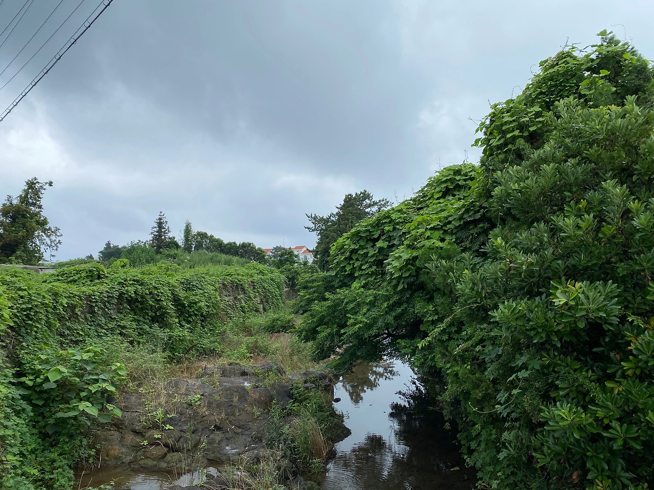 너울도 높았고, 비도 내렸던 오전. 올레길을 걷기 시작하는데도 빗방울이 조금씩 떨어진다. 흐리지만 눈부신 날씨이다. 하천 하나를 지난다. 동회수천이다.