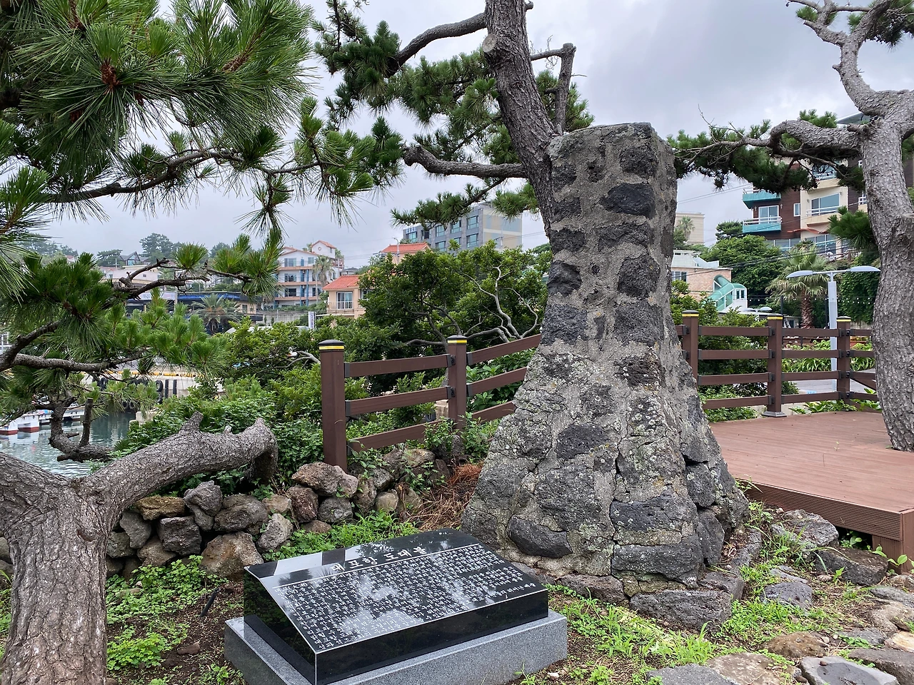 오늘은 파도가 매우 높은 날. 프리다이빙 트레이닝을 갔다가 눈 앞에서 섶섬을 가리는 너울 세례에 바다에 토를 쏟은 날이다. 그래서 그리 오래 걸을 계획은 없다. 가는 데까지 가보자. 월평 아왜낭목을 13시 20분 출발한다. 중문에 숙소가 있어 집 가까이로 간다는 왠지 모를 편안함도 함께 장착하였다. 아왜낭목은 아왜나무가 있는 길목이라는 뜻이다. 달의 형체를 띠고 있는 월평마을은 달의 모양이 이어지지 않아 풍수상 허하다고 하여 정기가 빠져나간다고 생각했다. 그래서 아왜나무를 심었는데, 1930년 월평마을 출신 재일교포들이 아왜낭목 부지를 매입하고 소나무를 심었다. 아무래도 아왜나무만으로는 부족하다고 생각한 듯하다. 이후 도로 확장 공사가 일어나 아왜나무는 벌채되어 없어지고 소나무만 남게 되었다. 현재는 ‘아왜낭목’의 장소성을 살리기 위해 아왜나무 몇 그루가 심겨있는 상태이다.