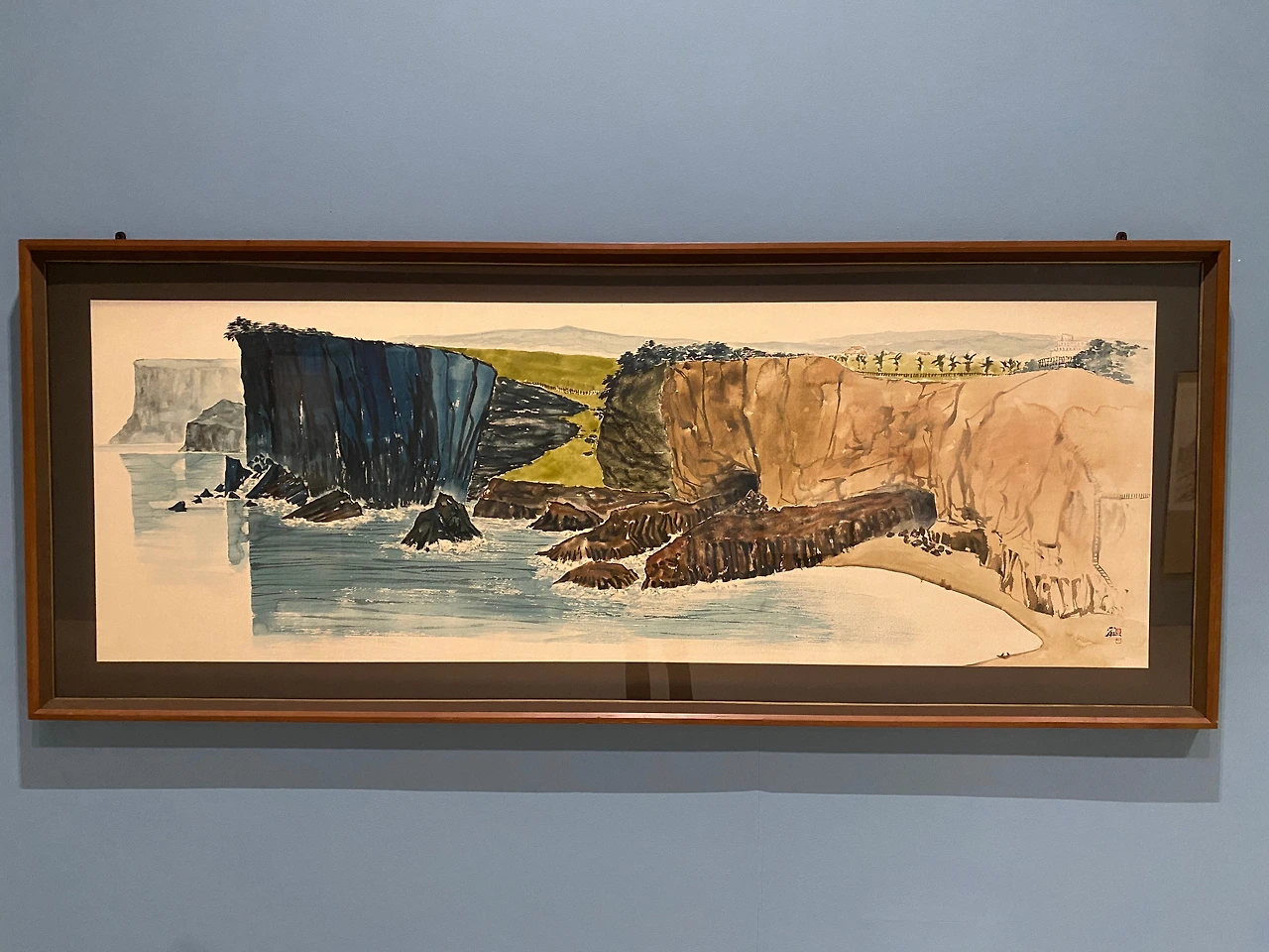 제주를 주제로 한 그림이 있었다. 그것도 내가 좋아하는 수묵화로 된 작품들이었다. 박대성 화백의 그림이 좋아 검색해보니 경주에 솔거 미술관에 작품이 많고 전시 중이라 찾아가 보겠다고 다짐한다. <서귀포> 풍경은 어디인지 특정 지을 수 없지만 특정 지울 수 있을 것 같든 서귀포 특유의 절벽과 주상절리가 있다. 까만 현무암과 갈색의 조면 안산암까지 표현된 듯하다. 그리고 뒤에 보이는 야자수가 낯설지 않다. 오른쪽 상단에 위치한 건물은 소라의 성처럼 보이기도 한다. 가장 원경에는 완만한 한라산까지 바다에서 제주를 바라본 완벽한 서귀포 풍경이다. 과감하면서도 단순화한 구성으로 내가 기억하고 있는 서귀포 파도가 현무암에 부딪치는 소리가 들리는 듯하다.
