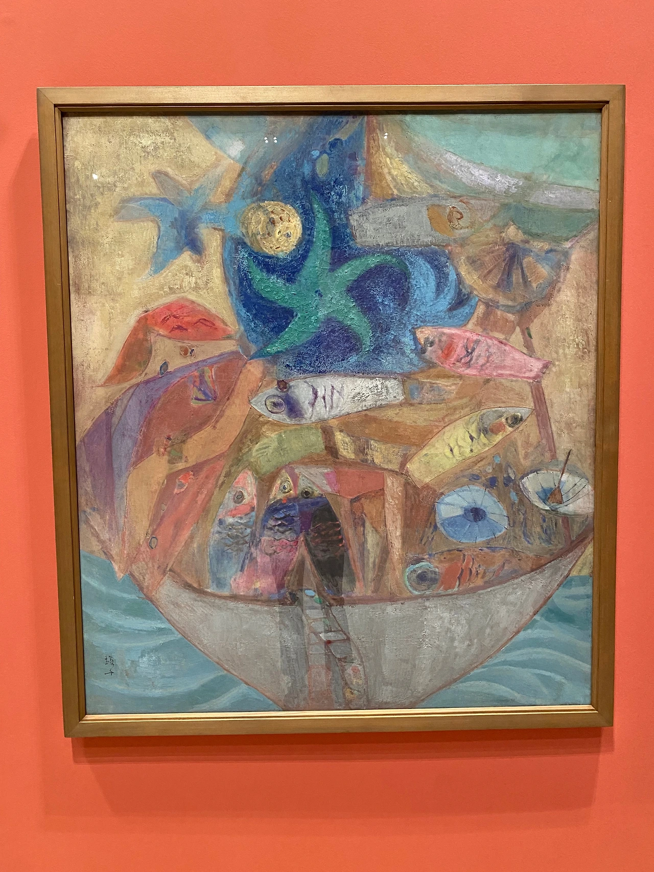 전라남도 고흥 출신인 천경자 화백의 그림을 처음 보았다. 그림은 못 봤어도 이름은 유명한 천경자 화백. 작가는 자신만의 고유한 표현을 가지는 게 중요하다. 한국화가 임에도 독보적인 개성을 가졌던 천경자 화가의 그림은 화려하고 다양한 색채를 사용하며 환상적인 느낌을 준다. <만선> 작품에는 형형색색의 물고기들이 가득 차 있고, 실제보다 훨씬 과장된 크기도 그려져 있다. 실제 이런 만선이라면 무서울 것 같다는 느낌이 들 정도이지만, 그림은 동화 같다. 얹혀 있지 않고 허공에 떠 있는 듯한 조개와 물고기들 때문에 그런 분위기가 느껴지는 듯하다. 별인지 불가사리인지 구분되지 않는 별, 그리고 달이 보여 밝은 색채에도 밤을 느끼게 해 준다.
