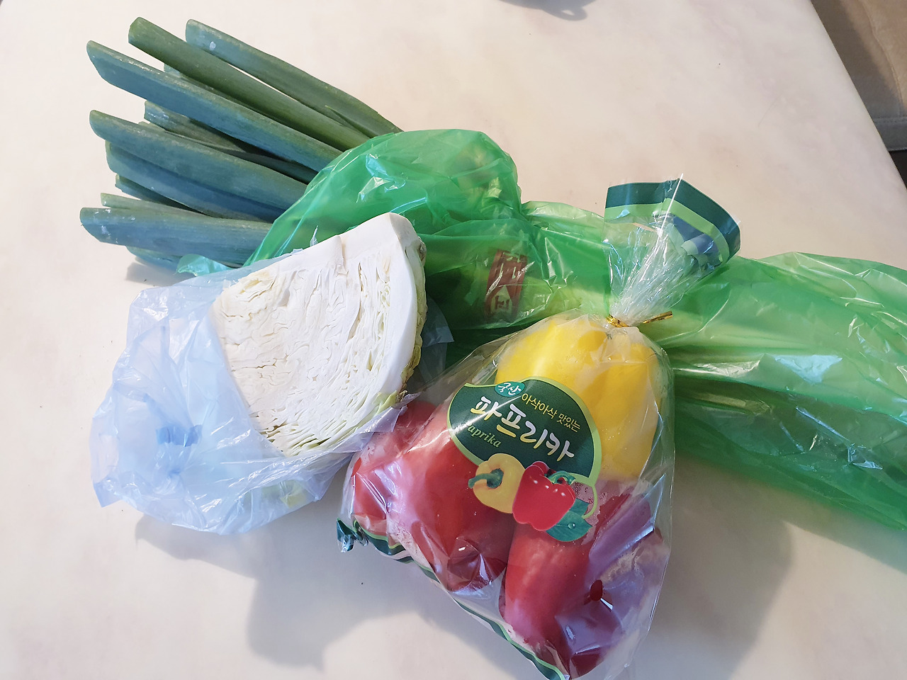 그렇게 해서 서로 전혀 관련이라고는 없는 바지락 한 봉지, 파프리카, 양배추, 파 한단이 내 장바구니에 덩그러니 남겨졌다는 슬픈 사연.