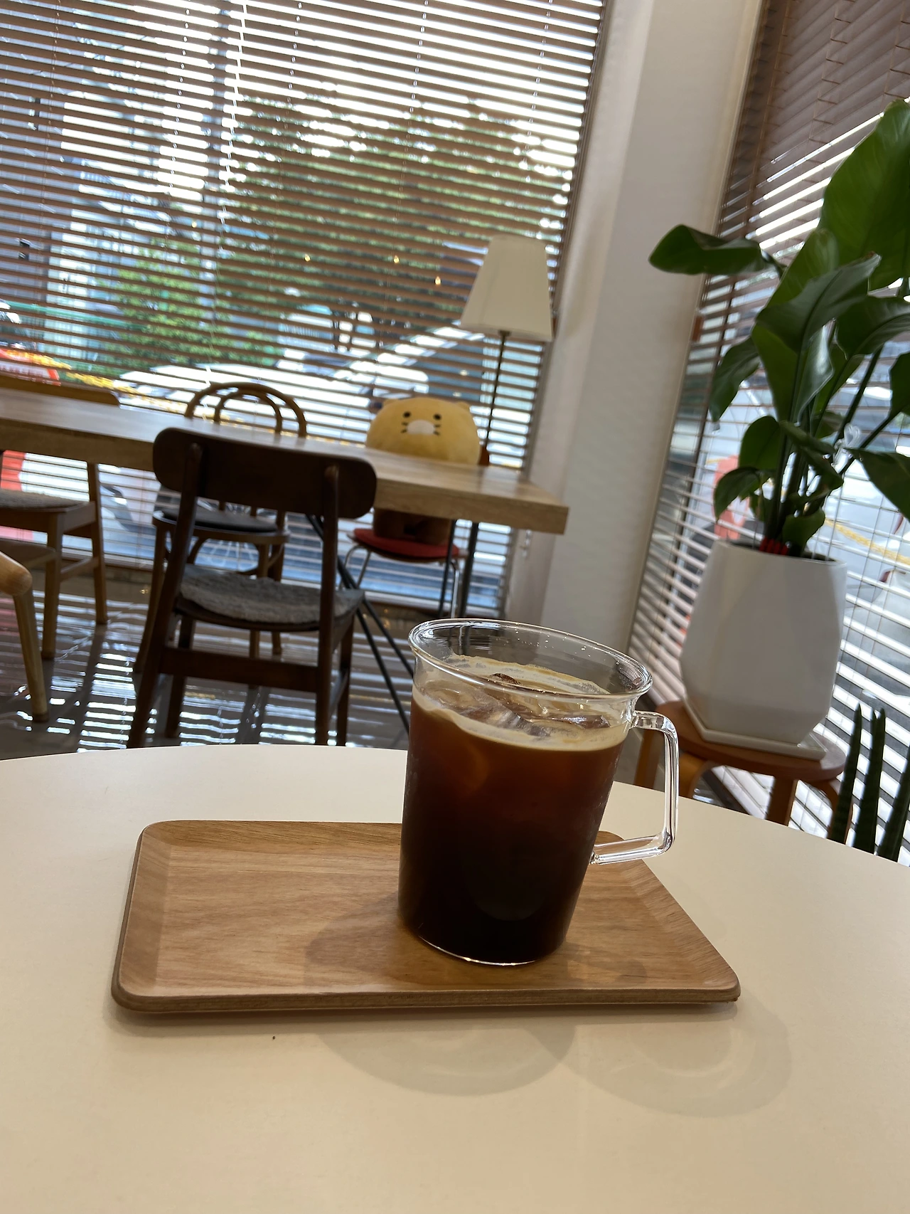 다음으로 간 곳은 카페 춘식이. 강릉에 시댁을 둔 친구가 지역 주민만 아는 보석 같은 집이라며 오늘 아침에 소개해 주었다. 단층 건물인 데다 대형 트럭에 가려 코앞에 두고도 한참을 헤맨 끝에 간신히 찾았다. 춘식이에 카페라니... 뭔가 어울리지 않는 조합의 이름이라 호기심을 자극한다. 카페의 규모는 아담하지만 넉넉하게 여백을 많이 둔 인테리어에 세련미가 있다. 사장님은 친근하고 동글동글한 얼굴에 강릉 억양을 가진 아주머니인데, 노란색의 상큼한 니트탑을 입고 카페 인테리어에 포인트가 되어 주셨다. 가장 큰 6인용 테이블에는 카카오 프렌즈의 춘식이 캐릭터 인형이 한 자리를 당당히 차지하고 있었다. 그래서 이름이 춘식이 카페인가? 하고 사장님께 여쭤보니, 카페의 이름은 이 캐릭터가 아니라 사장님의 어머니 함자에서 따온 것이란다. 어머님의 함자가 춘식인데 한번 들으면 잊히지 않을 이름이라 카페 춘식이로 지었다고 한다. 뜻밖의 이야기에 웃음이 절로 난다. 아이스 아메리카노를 한잔 주문하여 마시다 보니 베이커리 테이블에 물질하는 춘식이 인형도 있다. 나름 해녀 복장을 제대로 갖추었고, 테왁 위에는 문어까지 한 마리 앉아있다.