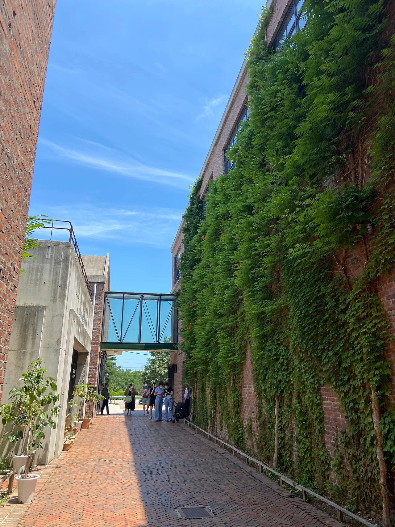 그렇게 테라로사에 대한 충성심을 형성한 내가 강릉에 있으면서 본점을 안 가볼 수는 없다. 카카오내비에 찍어보니 단 8분이면 도착할 수 있다고 한다. 주차장에 들어서 보니, 왜 강릉 본점을 커피 공장이라고 하는지 알겠다. 일단 스케일이 어마어마하다. 입구 쪽으로 걸어가면 은은한 빛깔의 벽돌을 쌓아 올린 외벽이, 여름에 이런 표현이 어떨지 모르겠지만, 따스한 느낌을 준다. 그러니까 온도가 따스하다기보다는 따스한 환대의 느낌이라고 이해해 주면 좋겠다. 몇 발짝 더 들어가면 그 벽돌벽을 뒤덮어 지붕까지 이어진 능소화 덩굴이 청신하다. 지금 살고 있는 친구 집에도 능소화 덩굴이 있는데 아치형 지지대에 다소 아슬아슬하게 매달려 있다. 이렇게 벽돌벽을 타고 올라가니 안정감이 있어서 좋다. 매장 안으로 들어가니 노출 콘크리트, 벽돌, 철재 등 건축자재를 그대로 드러낸 뻥 뚫린 공간에 감각적인 조명과 미술품, 창문을 적절히 배치하여 개방감 넘치고 자유로운 분위기가 느껴진다. 세종점이나 포스코센터점은 누가 뭐래도 도시적인 느낌이 강한데, 이곳은 조금 더 편안하고 다정하다고나 할까?