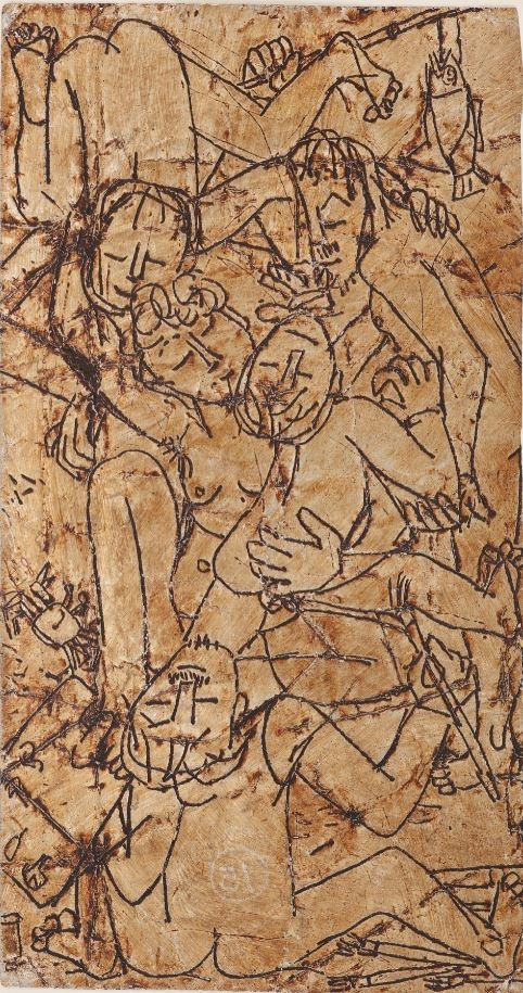 은지화는 담뱃갑 그림으로도 불리는데, 담배를 포장하는 알루미늄 속지에 철필이나 못으로 윤곽선을 눌러 그린 후 검은색 물감을 문질러 넣어 선이 두드러지게 만든 그림이다. 고려청자를 만들 때 썼다는 상감기법과 같은 원리이다. 종이도 화구도 구하기 어려웠던 상황에서 이중섭이 만들어낸 새로운 기법인데, “필요는 발명의 어머니"라든가 "궁하면 통한다"는 말은 이럴 때 쓰라고 있는 거다. 담배 포장지는 흔히 찢어져 있어서 모양이 반듯하지 않은 경우가 많다. 한쪽 귀퉁이가 찢어져 나갔거나 아래쪽 모서리가 치맛단처럼 물결치기도 한다. 미술관 조명 아래서는 상당히 가까이에서 집중해서 보아야 정확한 선을 볼 수 있다. 은지화에 비하면 엽서화는 그나마 윤택한 시절의 그림이었구나 싶다.