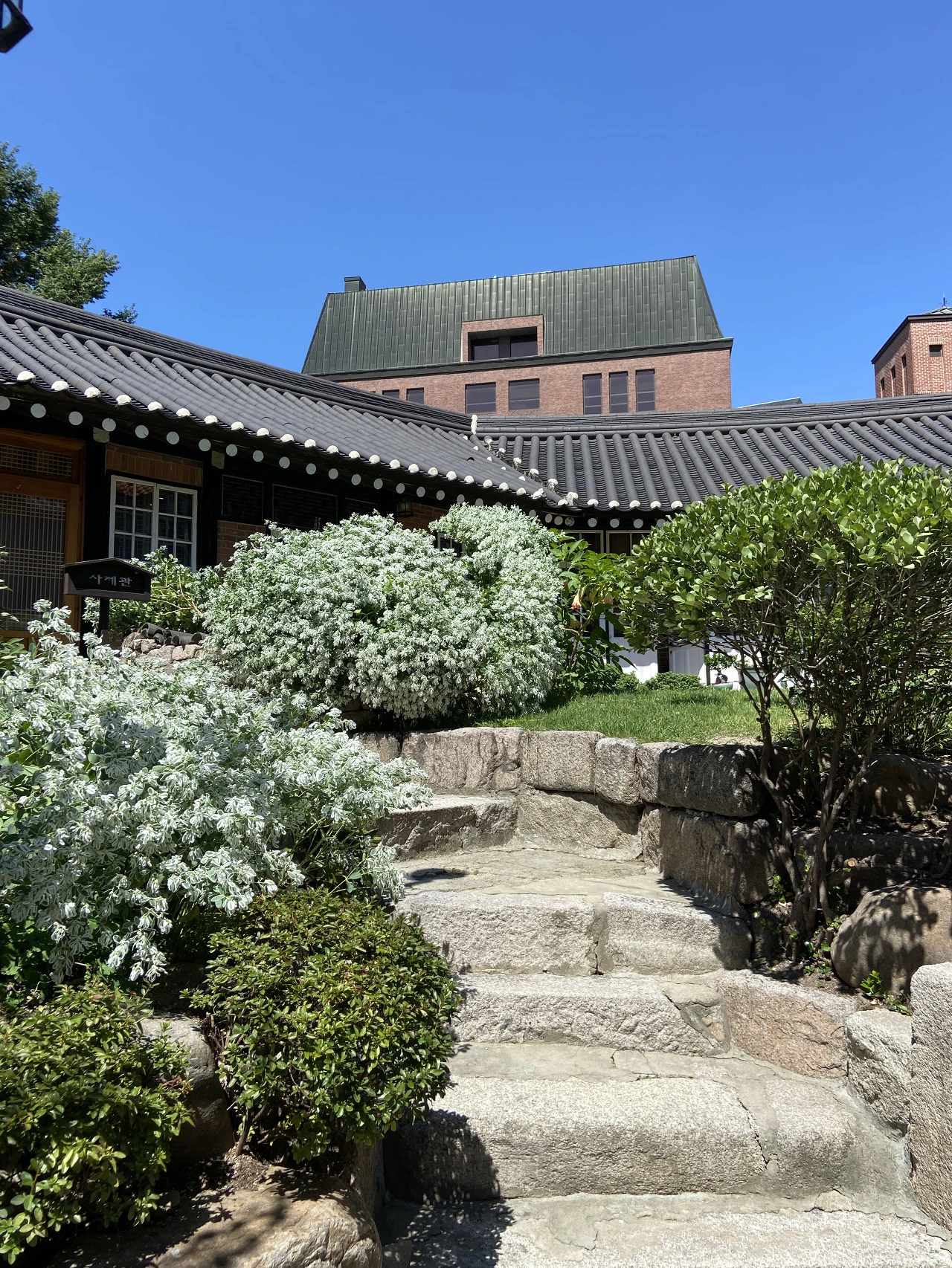 성공회 서울주교좌성당은 1926년에 건축된 석조건물이다. 화강석과 붉은 벽돌로 지어진 이 건물은 로마네스크 양식에 한국 전통기법을 조화시킨 것이라고 하는데, 건축양식에 대해 까막눈이라 어떤 면이 로마네스크 양식인지는 공부를 좀 해봐야 알 것이다. 성당 전체의 외형은 위에서 내려다보았을 때 십자가 모양이라고 한다. 건물의 상층부는 각각 서로 다른 높이와 모양, 크기, 색깔의 지붕으로 구성되어 있어 율동감이 느껴진다. 아이가 어렸을 때 나무 블록으로 성을 지으면 이렇게 지붕과 테라스의 모양을 다양하게 만들곤 했던 기억이 난다.