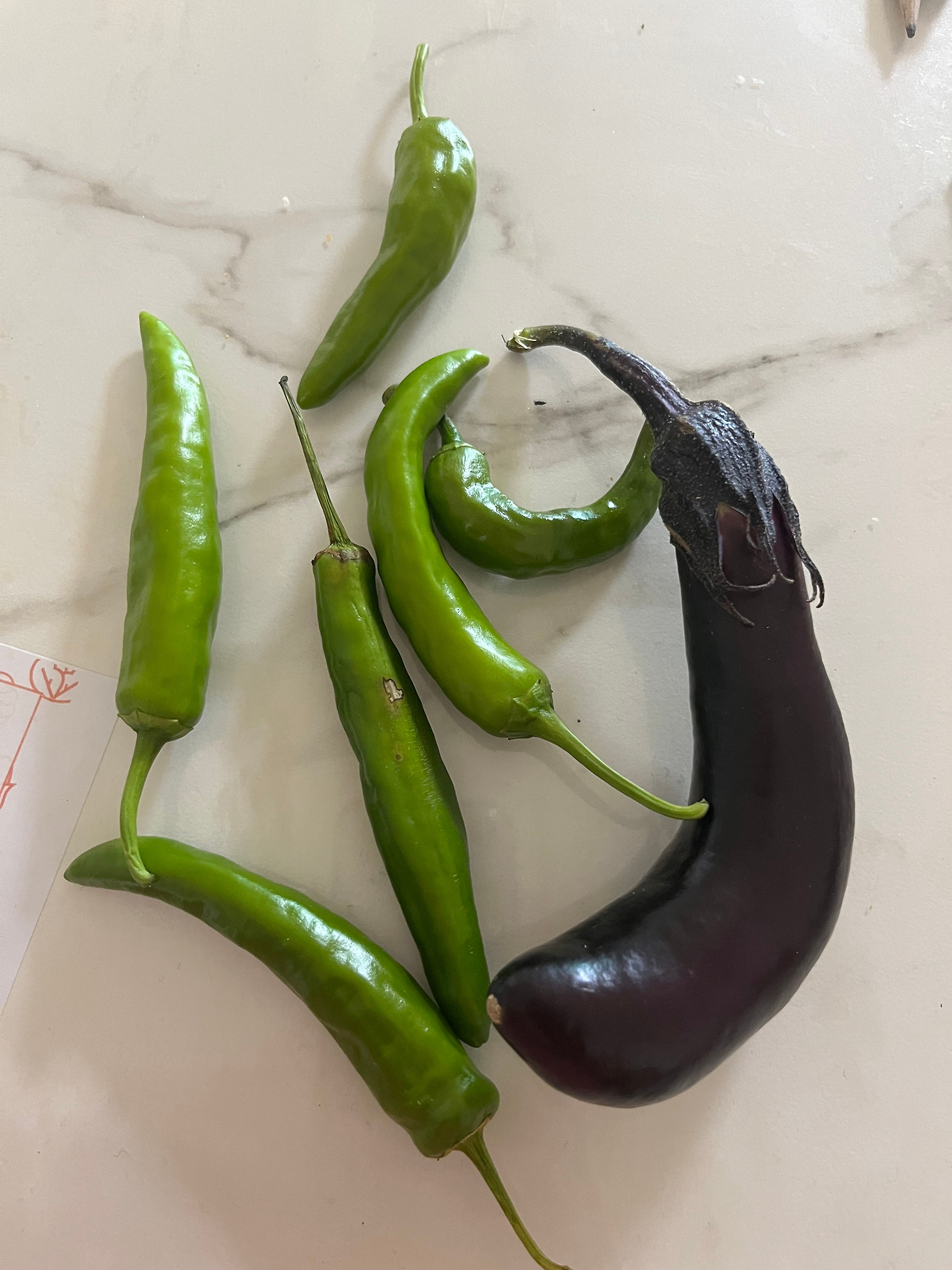그나마 생생한 고추, 가지를 약간 따 왔다. 밭에 갔는데 빈손으로 오기 섭섭해서.