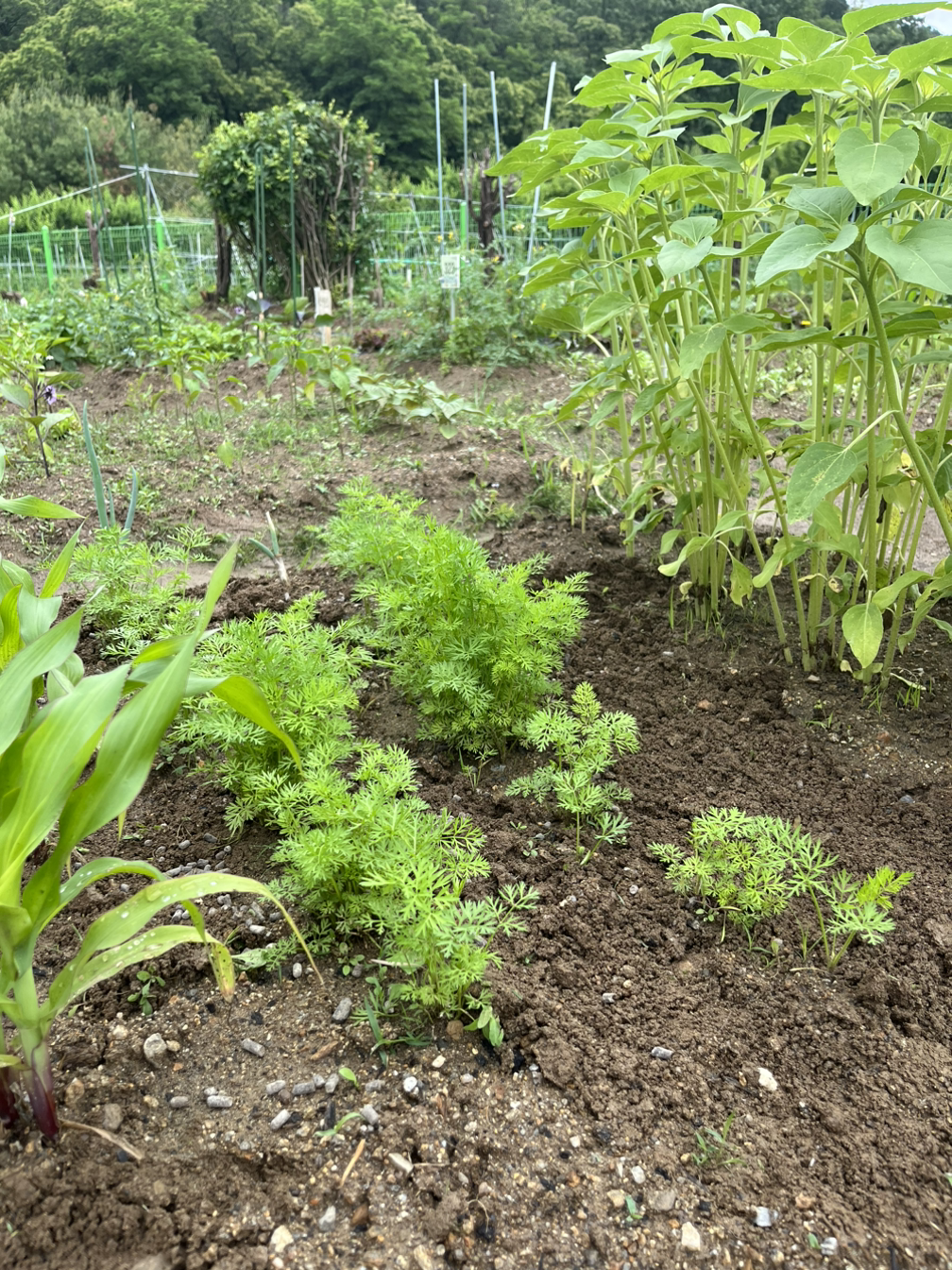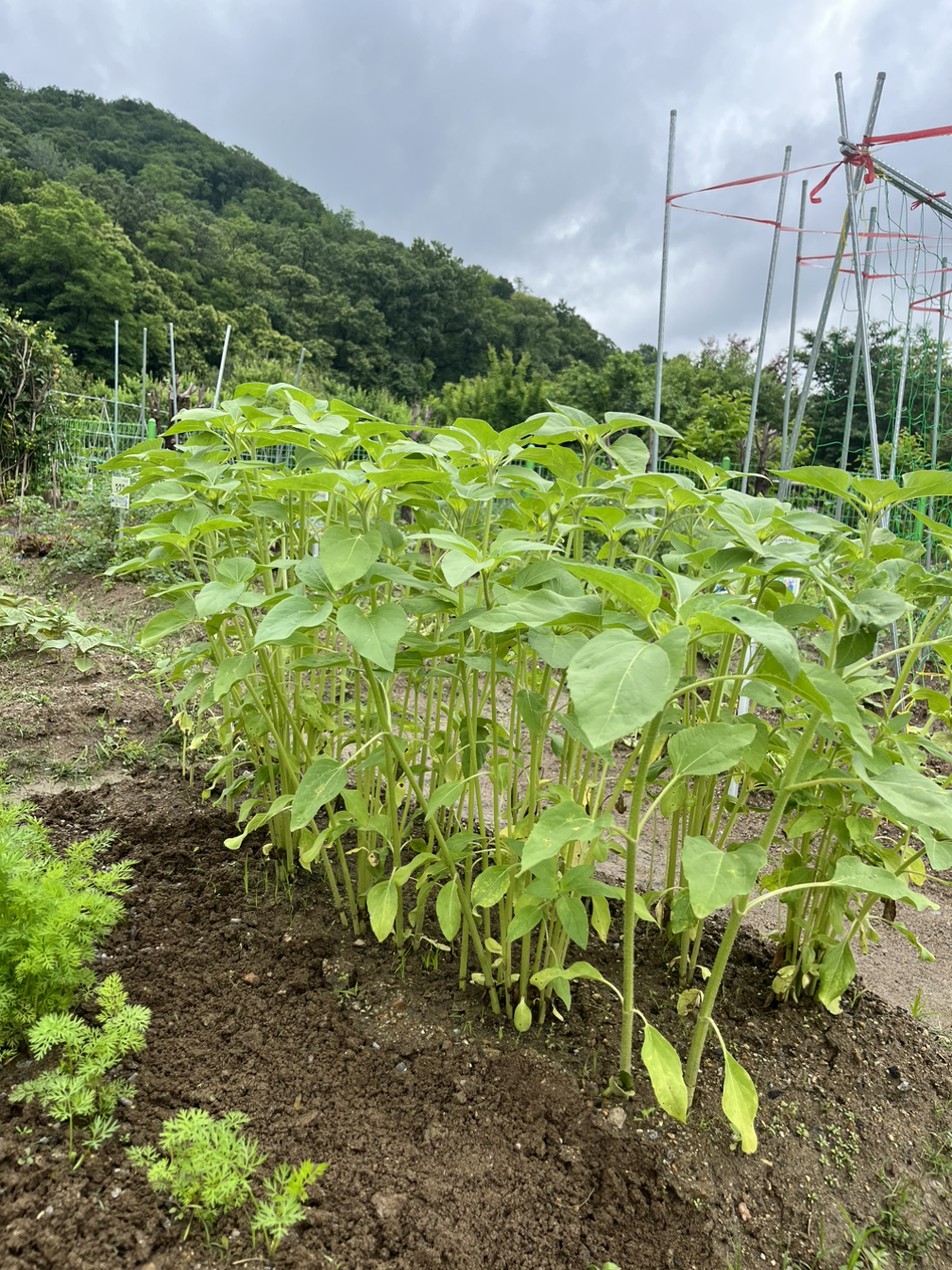 해바라기는 부쩍 키가 자랐고, 그 옆에 있는 당근도 제법 존재감을 뽐내고 있으며, 양배추도 이파리가 꽤나 넓어졌다. 그저 재미로 하는 텃밭이라 종류도 이것저것, 심은 모양도 들쑥날쑥이지만 각기 저마다 생긴 대로 그 모습을 드러내주는 것이 반갑다.
