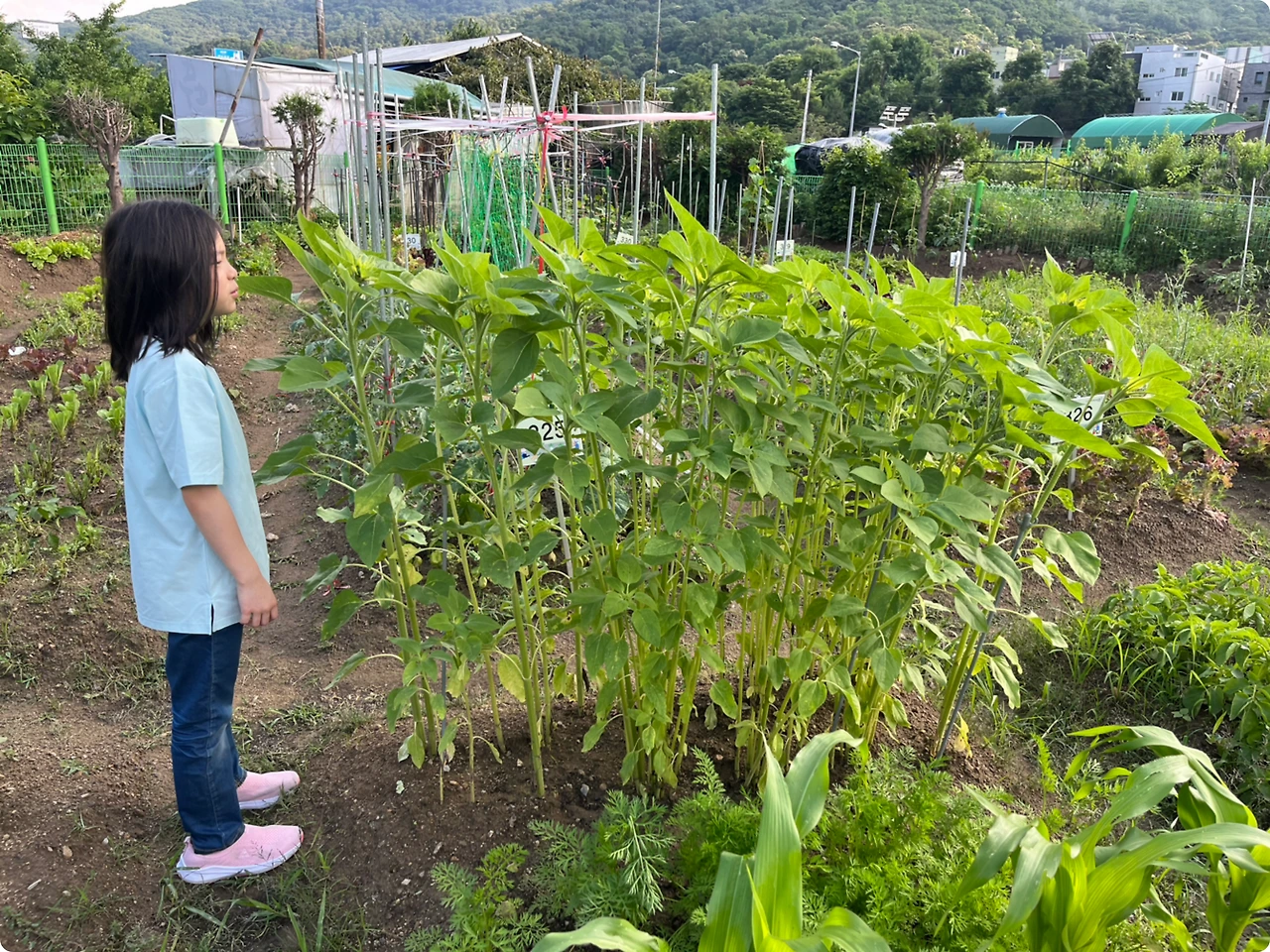 고추는 아직 키가 작은데도 고추가 열렸고, 해바라기는 우리 딸 키만큼 자랐다.