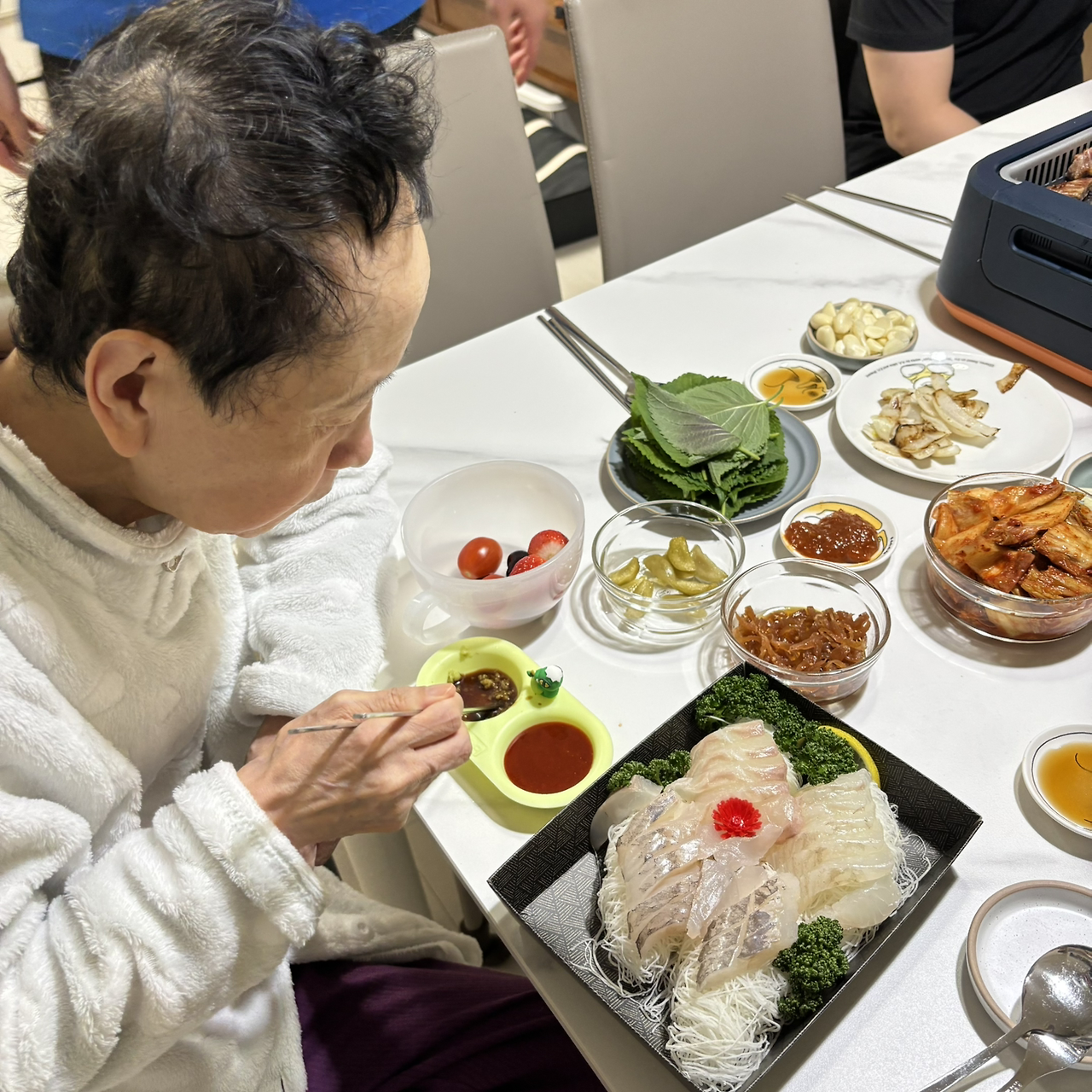 나 혼자 목욕 시킬 자신이 없어서, 엄마에게 전화하니 10분 뒤 도착이란다. 10분 동안 할머니를 식탁 의자에 따뜻하게 앉혀놓고 목욕 준비를 했다.