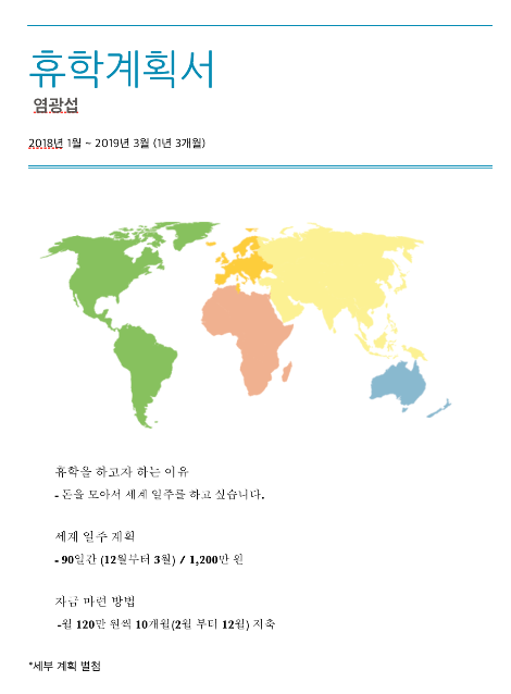 큰 주제별로 목차를 나누고, 나눈 주제별로 자세한 계획을 세웠습니다. 휴학 기간 동안 돈을 모으면서 다른 걸 할 수 있는지(자격증 / 영어공부 등등). 어디서 살지. 무슨 아르바이트를 할지. 항공권은 언제 사야 하는지.