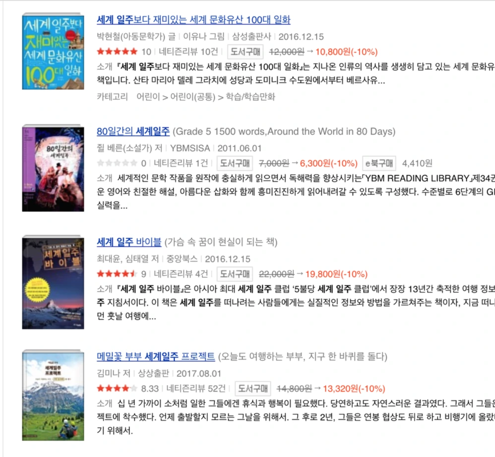 이제부턴 돈을 아껴야 할 것 같았거든요. 여행에 얼마가 필요할지 모르고, 언제 출발할지도 모르잖아요. 네이버를 끄고 알라딘이라는 사이트에 들어갔습니다. 알라딘은 중고서적들을 매입해서 판매하는 곳인데, 정가보다 크게는 50% 정도 할인해서 살 수 있죠. 그곳에서 다시 ‘세계 일주 바이블'을 검색했고, 운이 좋게도 책이 9,900원에 올라와 있더라고요.