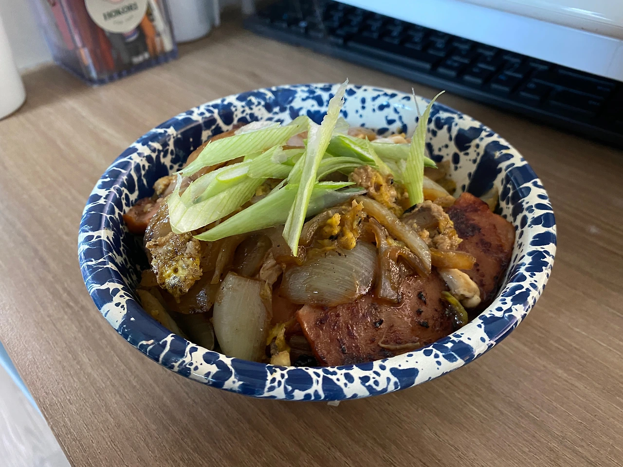 점심식사 시간. 평소 같았으면 시켜둔 도시락을 먹겠지만 이제 내가 밥을 해 먹어야 한다. 미리 해둔 밥 위에 햄과 양파, 소스를 곁들인 햄 돈부리를 완성한다. 기존 맛보다 섬섬했지만 그럭저럭 훌륭한 점심식사였다.