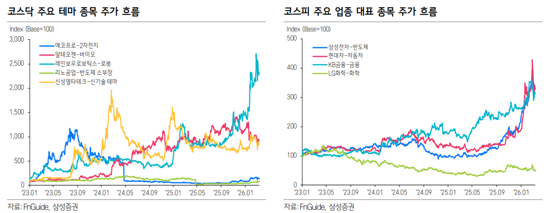 현재 시장의 흐름을 보면 산업 구조의 패러다임 변화와 강력한 수급 정책이 맞물리는 [멀티플 확장]의 내러티브가 붙고 있습니다. 특히 기존의 전통적인 PER 밸류에이션에서 코스닥의 시총 상위주들이 고평가 된 것으로 보일 수 있으나, 세부 섹터별로 살펴보면 질적으로 다른 성장 논리가 작용합니다. 가령, 바이오텍 분야는 글로벌 빅파마와의 대규모 기술이전(L/O)을 통해 신약 파이프라인의 가치를 실질적인 데이터로 증명하는 단계. 로봇과 2차 전지 섹터 역시 휴머노이드 산업의 본격화와 우주·ESS 등 새로운 전방 시장의 출현으로 인해 기존 멀티플의 상단이 열리는 '리레이팅'. 반도체 소부장 기업들은 글로벌 IDM 기업들의 공격적인 Capex 확대에 힘입어 실질적인 이익 성장(EPS 성장)까지 뒷받침되고 있어, 밸류에이션의 정당성을 확보하고 있습니다.