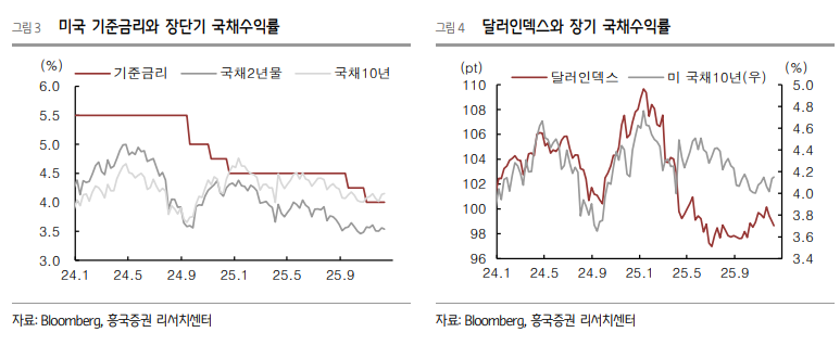 이러한 연준의 태도 변화는 물가에서 금리, 그리고 주식 시장으로 이어지는 거대한 파급 경로를 만들어내고 있습니다. 먼저 물가 측면에서는 유가 상승과 관세 영향이라는 새로운 암초를 만났습니다. 특히 비주거 부문의 물가 압력이 해소되지 않은 상태에서 원자재 가격까지 오르다 보니, 물가가 목표치인 2%로 내려가는 길은 더욱 멀고 험난해졌습니다. 이에 반응하여 시장 금리의 기준이 되는 국채 2년물 금리가 급등하고, 달러의 가치를 나타내는 달러지수가 100을 돌파하는 등 금융 시장은 즉각적으로 긴장하기 시작했습니다. 금리가 오르면 기업 가치를 평가할 때 적용하는 할인율이 높아지기에, 주식 시장, 특히 미래 성장에 기대를 거는 성장주들은 강한 하방 압력을 받을 수밖에 없습니다.