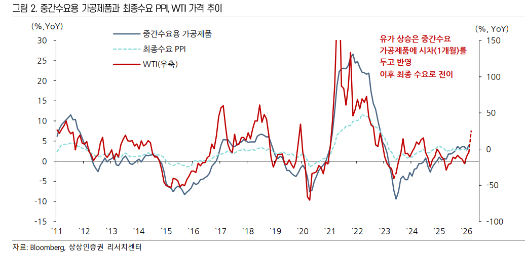 이 파동의 첫 번째 단계는 즉각적입니다. 유가가 오르면 공장에서 제품을 만드는 데 필요한 에너지 원재료 가격이 가장 먼저 치솟습니다. 이것이 아래의 그림에서 말하는 생산자물가(PPI)의 중간수요 단계입니다. 하지만 우리가 주유소에서 넣는 휘발유나 경유 가격이 실시간으로 똑같이 변하는 것은 아닙니다. 원유가 정제 과정을 거쳐 실제 연료가 되기까지는 보통 한 달 정도의 시간이 걸리기 때문입니다. 이것이 바로 파동의 두 번째 단계인 에너지 가공 제품으로의 반영입니다. 진짜 무서운 것은 세 번째 단계입니다. 기름값이 오르면 물건을 실어 나르는 트럭의 운송비가 비싸지고, 비닐하우스를 돌리는 연료비가 오르면서 식품 가격까지 줄줄이 영향을 받습니다. 처음에는 기름값만 올랐던 것이 이제는 기름과 상관없어 보이는 빵이나 채소, 서비스 요금까지 밀어 올리는 압력으로 작용하는 것입니다. 이렇게 에너지에서 시작된 불길이 비에너지 품목으로 옮겨붙어 타오르기 시작하면, 우리가 매달 확인하는 소비자물가(CPI)는 꺾이지 않고 계속 높은 수준을 유지하게 됩니다.