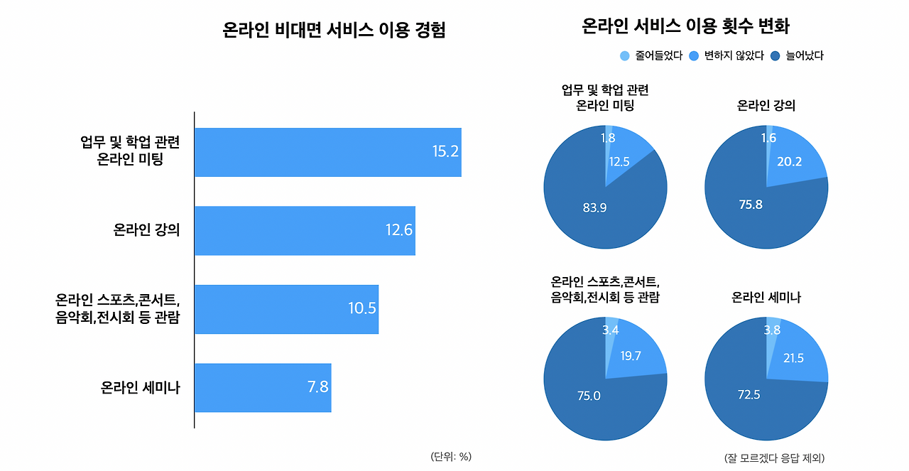 방송통신위원회(위원장 한상혁)가 2020년 코로나19 발생 이후 지능정보기술·서비스 이용자의 인식과 행태 변화를 조사한 바에 따르면 코로나19가 유행하기 시작한 2020년 1월 말 이후 온라인 서비스 이용 시간이나 횟수가 대체로 증가한 것으로 나타났다. 그중에서도 업무·학업 관련 온라인 미팅(83.9%), 온라인 강의(75.8%), 온라인 스포츠 관람·문화생활(75%), 온라인 세미나(72.5%) 순으로 서비스 이용 빈도가 증가했으며, 대면 서비스 대비 온라인 서비스의 장점으로 65.6%, 64.1%가 각각 시간과 장소에 제약 없이 이용 가능하다는 점에 대해 응답해 과반 이상이 동의하는 것으로 나타났다.