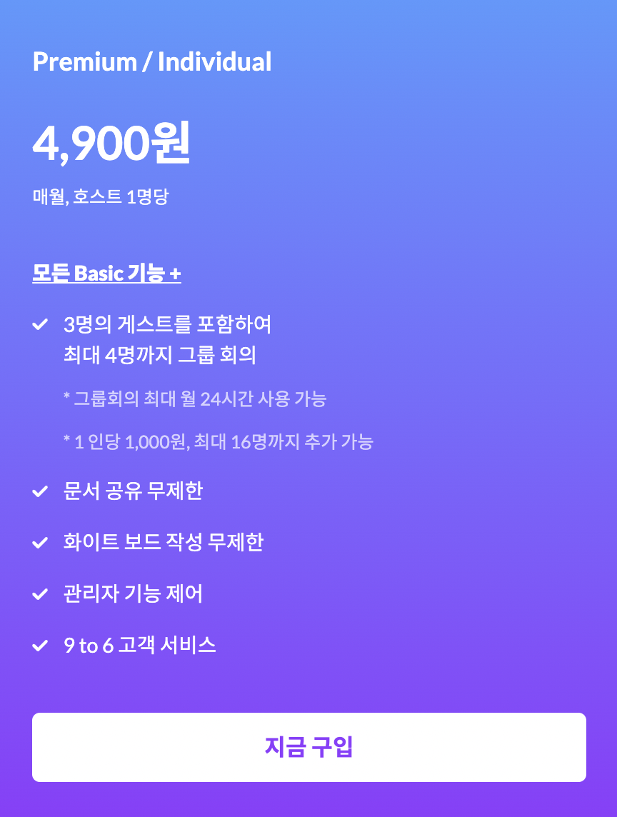 프리미엄은 월 4,900원의 정액 요금제이다. 그룹 미팅의 경우 매월 최대 24시간까지 사용 가능하며, 1개의 방에 최대 4명까지 초대가 가능하다. (5명 이상부터는 1명당 1,000원씩 추가 과금되며 16명까지 추가 가능) 최대 추가 가능 인원인 16명까지 추가하는 경우 매월 16,900원의 요금이 부과된다. 화면 공유, 문서 공유를 무제한으로 사용이 가능하며 무료 요금제 베이직과는 다르게 오전 9시부터 오후 6시까지 별도의 고객 서비스 지원이 가능하다. 현재 같은 목표를 가진 사람을 모집하여 정해진 인원으로 지속적인 스터디를 갖는 사람들이 주로 이 요금제를 이용하고 있는 것으로 확인되고 있다. 타 플랫폼에 비하면 굉장히 저렴한 가격으로, 줌(ZOOM) 한 달 이용료의 경우 세금 포함 한화로 약 2만 원이다.