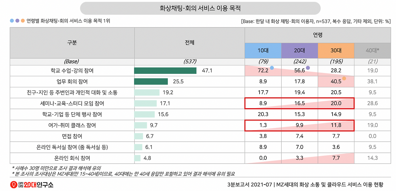 위 정보는 대학내일 20대 연구소에서 연령별 화상채팅∙회의 서비스와 클라우드 서비스 이용 행태를 알기 위해 실행한 3분 보고서 'MZ세대의 화상 소통 및 클라우드 서비스 이용 현황'의 자료 일부이다.