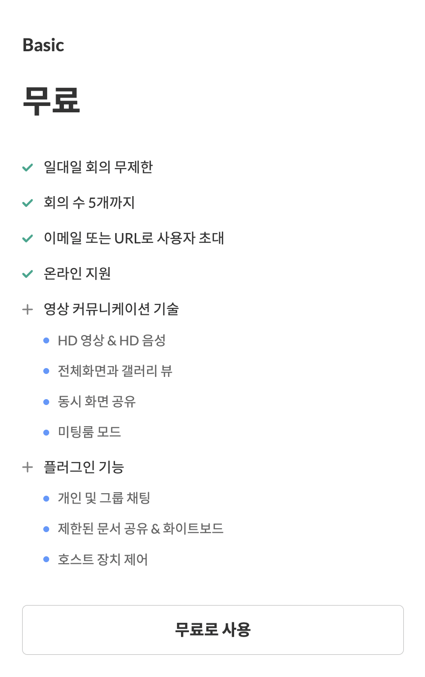 베이직(무료 요금제)는 1:1 회의시간은 무제한이지만 그룹미팅은 40분의 시간제한이 있다. 방은 최대 5개까지 개설할 수 있으며, 1개의 방에 16명까지 초대가 가능하다. 일부 제한되긴 하지만 화면 공유, 문서 공유, 출석부 등의 기본 기능은 모두 사용 가능하며 사이트 온라인에서 서비스 지원을 받을 수 있다. 무료라고 하지만 유료 요금제인 프리미엄 요금제와 사용하는 데 있어 큰 차이는 없으므로 무료 요금제로 계속 사용해도 된다. 단, 보다 원활한 온라인 수업을 위한 기능은 유료요금제인 엔터프라이즈의 교육모드(에듀케이션)에 맞춰져 있으며 이 에듀케이션에서만 문제/설문 기능을 사용할 수 있다. (화면 녹화도 엔터프라이즈일 때만 PC녹화를 통해서 가능하다.) 그 외에도 구루미는 스톱 워치, 공부 기록, 화이트보드, 화이트 노이즈 기능을 제공한다.(※해당 서비스 별도 옵션 구매 가능)