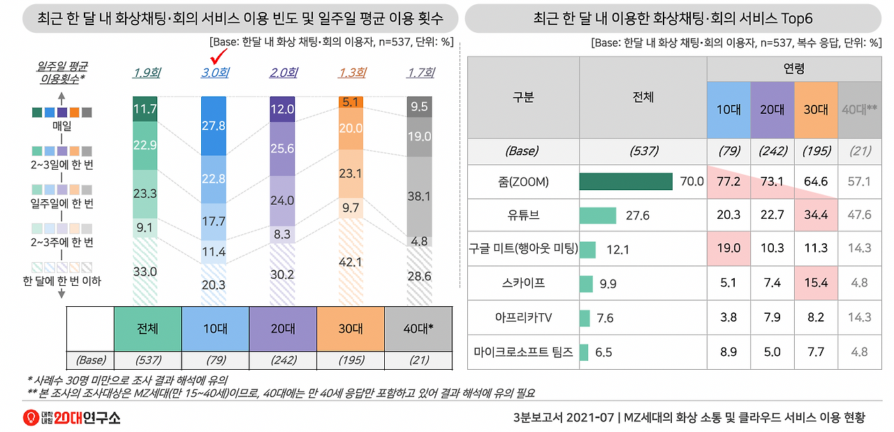 이 설문은 2021년 7월에 조사된 것으로, 조사 결과를 보면 10대의 경우 최근 한 달 내 화상채팅∙회의 서비스를 일주일에 평균 3.0회 이용한다는 사실을 알 수 있다. 자주 이용하는 화상채팅∙회의 서비스 순위로는 학교나 회사에서 많이 사용하는 줌(ZOOM)이 70.0%로 1위를 차지했으며 유튜브가 27.6%로 2위, 구글 미트(행아웃 미팅)가 12.1%로 3위를 차지했다.